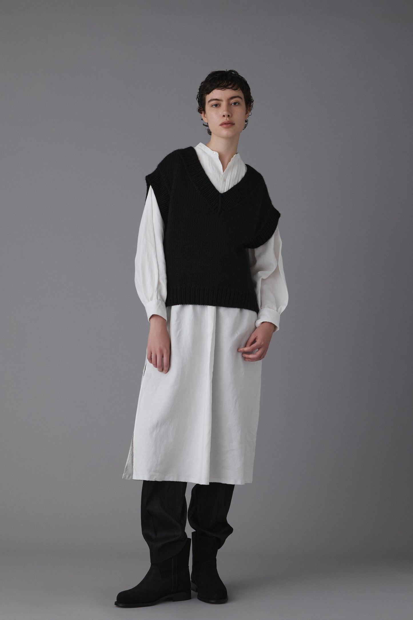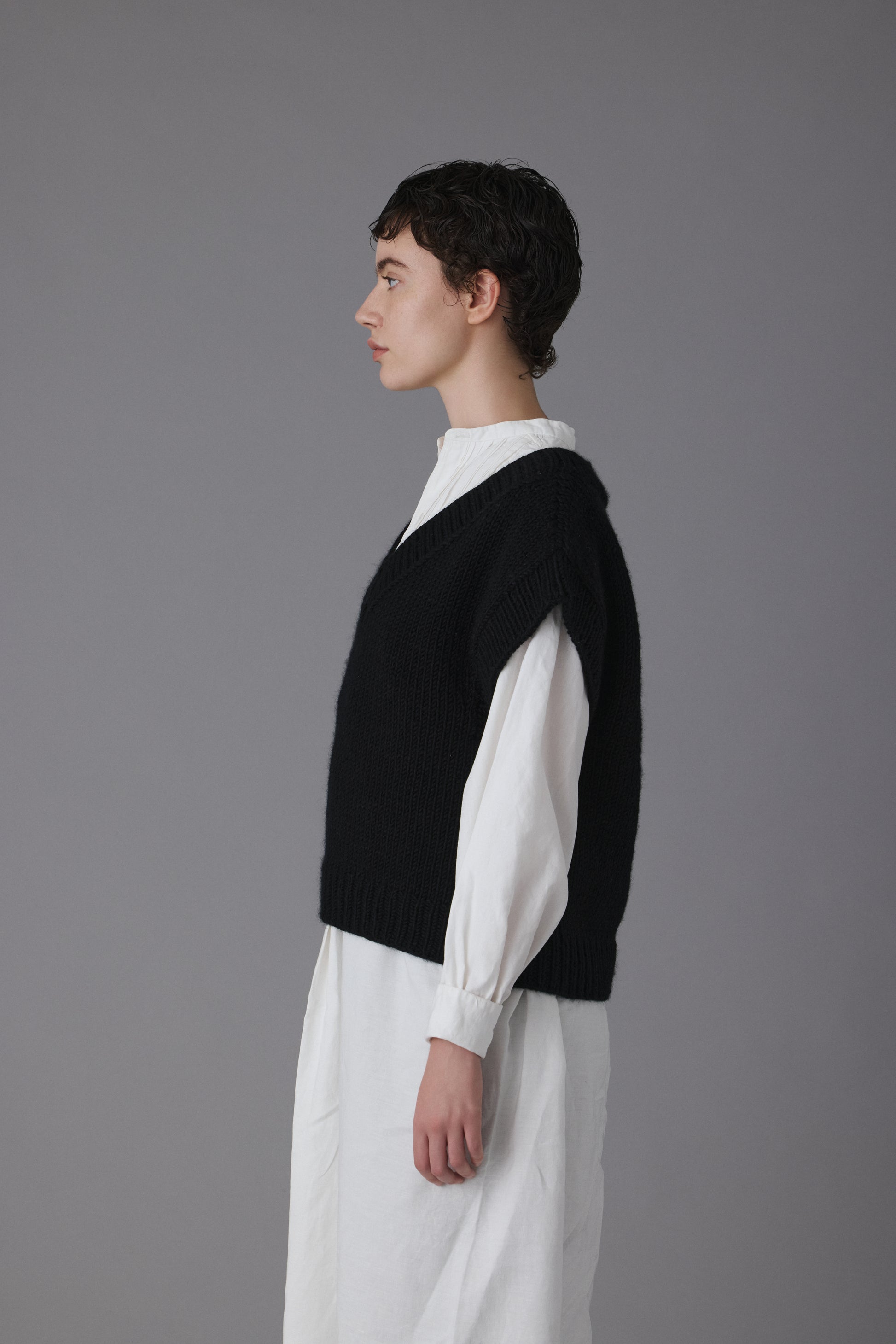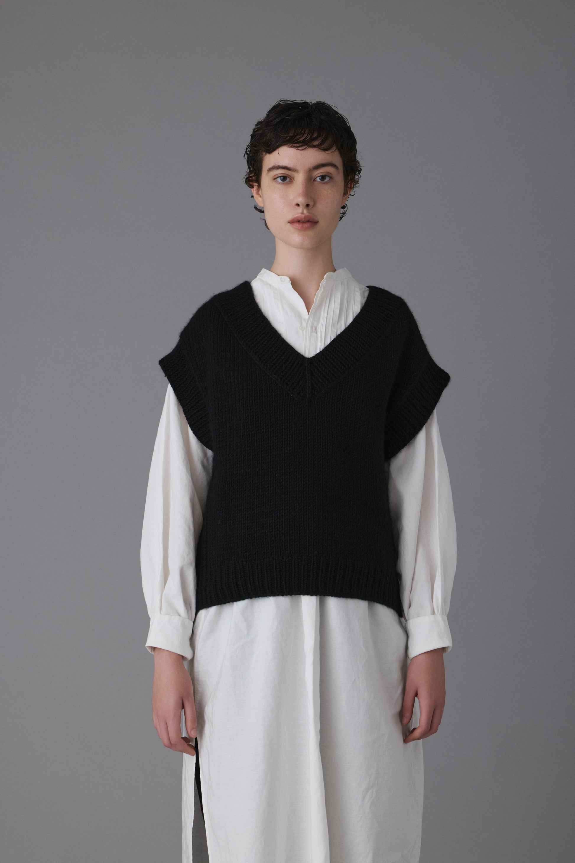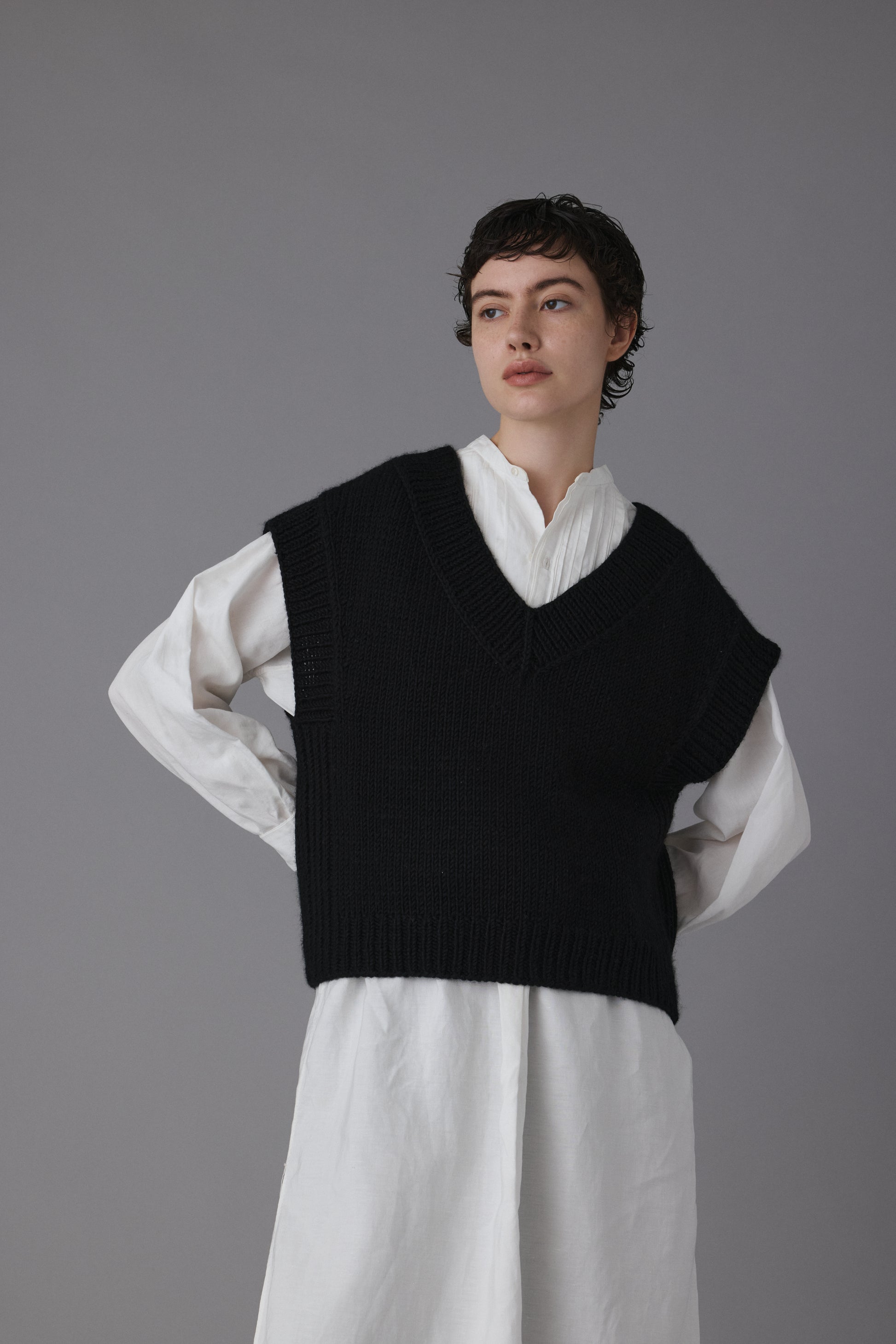 ウールに、わずかにカシミヤを加えたロービング糸。 わずかではあるが、カシミヤがもたらす柔らかなぬめりと肌なじみは驚くほど大きく、軽さとふくらみの中に、ほんのりとした上質感を纏わせています。 この糸を、棒針で一目一目、丁寧に手編み。 素材の呼吸を損なうことなく、ナチュラルで美しい立体感に仕立てました。 ボディはメリヤス編み、両脇にはリブ編みの切り替え。さりげないアクセントが、立体感と軽やかさを演出します。肩先に自然と沿うようなフレンチスリーブ風のシルエットは、まるで袖があるように見えながら、アームホールの開きが程よく、インナーとの重ね着もすっきり。Tシャツやシャツに重ねればトップス感覚に、ワンピースの上に重ねればジレのように、季節や着こなしに応じて印象を変える、自由度の高いベストです。