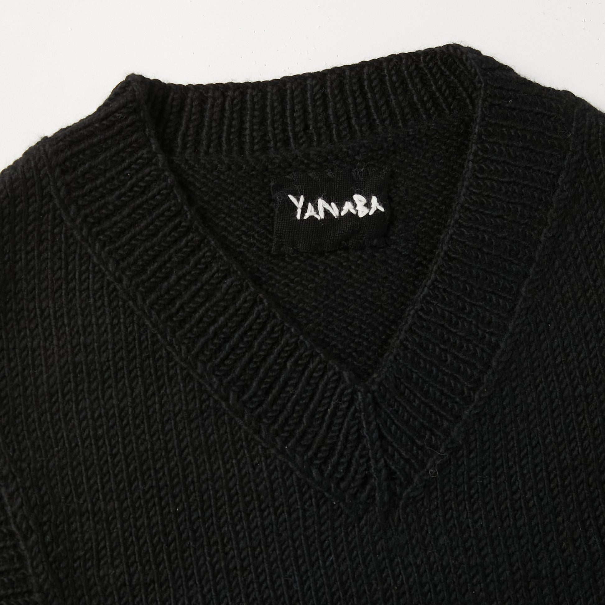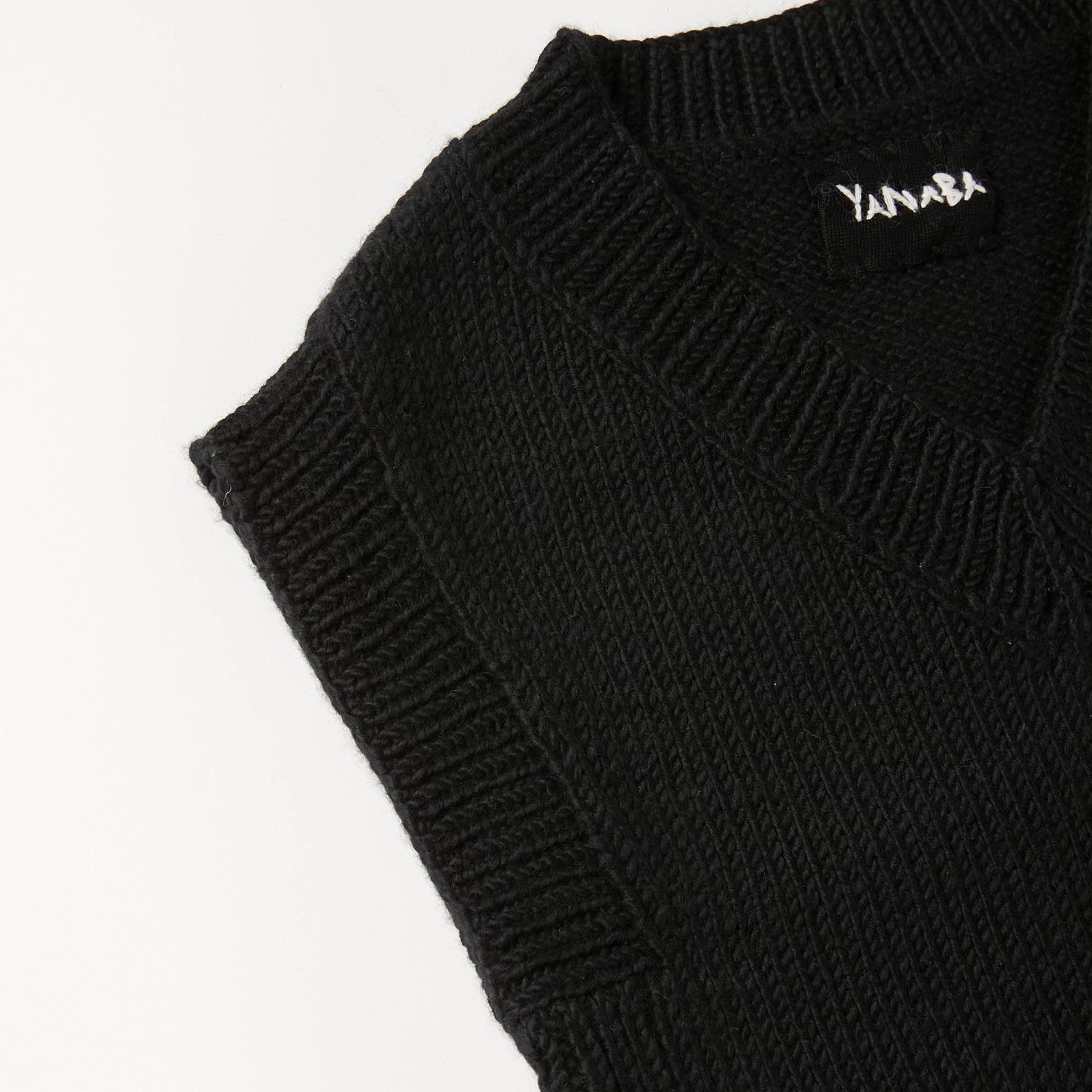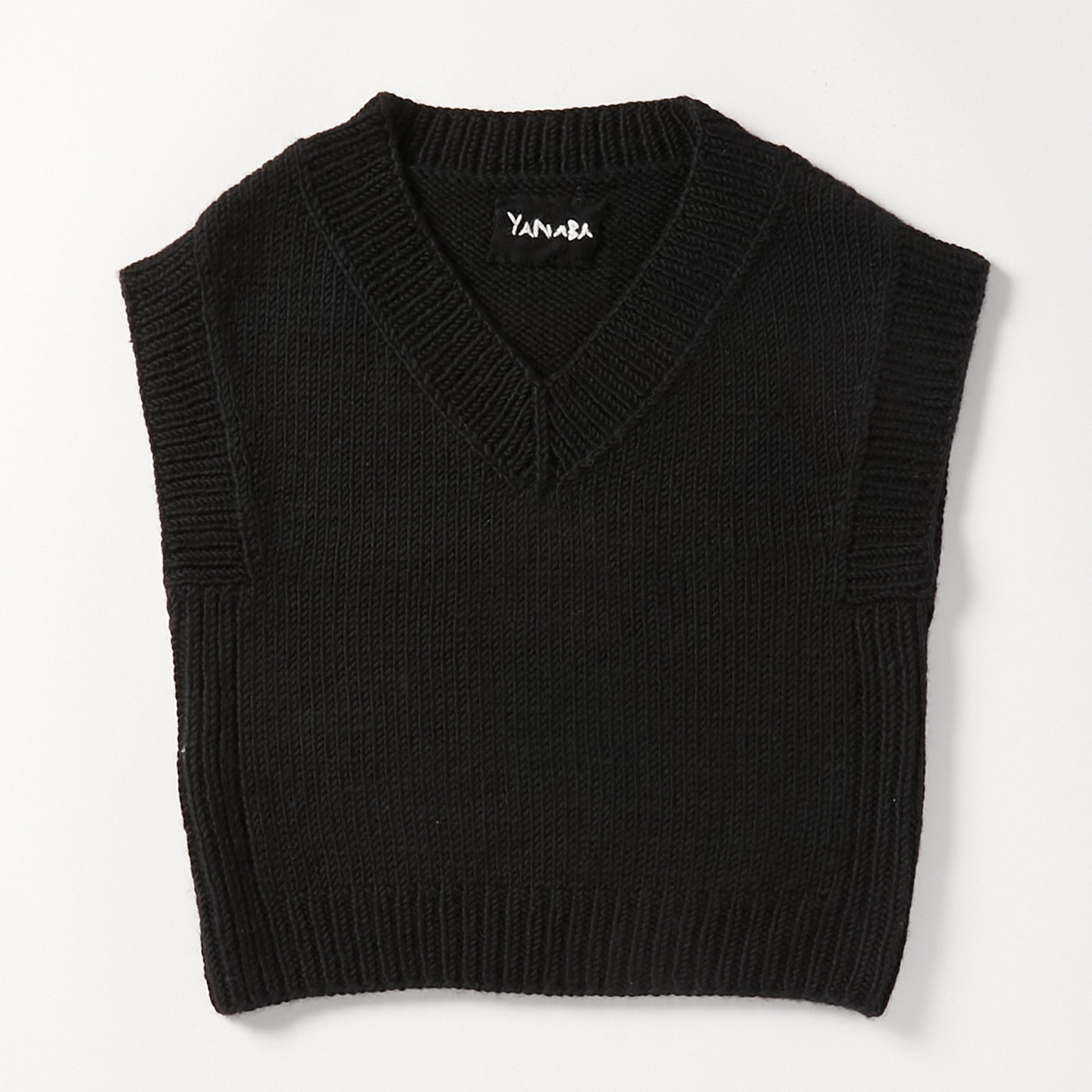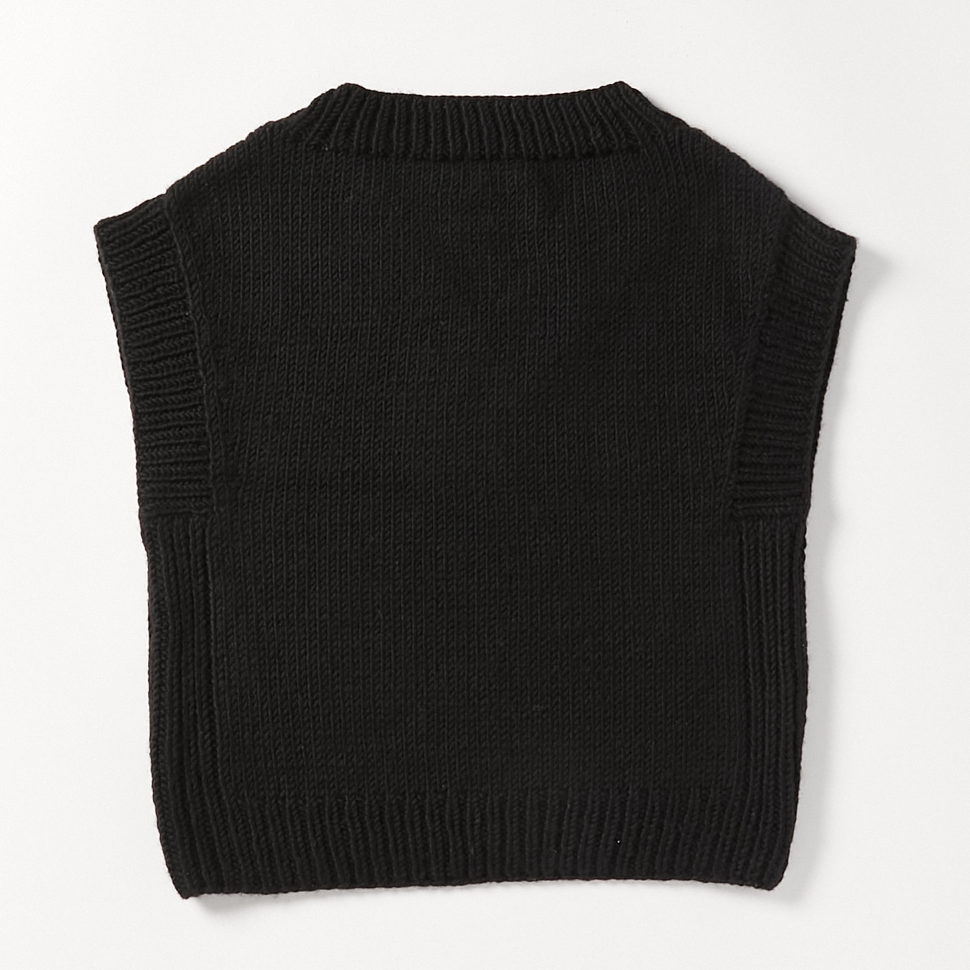 ウールに、わずかにカシミヤを加えたロービング糸。 わずかではあるが、カシミヤがもたらす柔らかなぬめりと肌なじみは驚くほど大きく、軽さとふくらみの中に、ほんのりとした上質感を纏わせています。 この糸を、棒針で一目一目、丁寧に手編み。 素材の呼吸を損なうことなく、ナチュラルで美しい立体感に仕立てました。 ボディはメリヤス編み、両脇にはリブ編みの切り替え。さりげないアクセントが、立体感と軽やかさを演出します。肩先に自然と沿うようなフレンチスリーブ風のシルエットは、まるで袖があるように見えながら、アームホールの開きが程よく、インナーとの重ね着もすっきり。Tシャツやシャツに重ねればトップス感覚に、ワンピースの上に重ねればジレのように、季節や着こなしに応じて印象を変える、自由度の高いベストです。