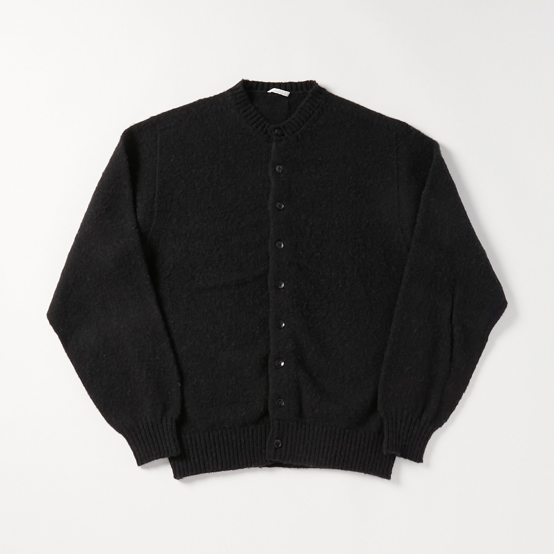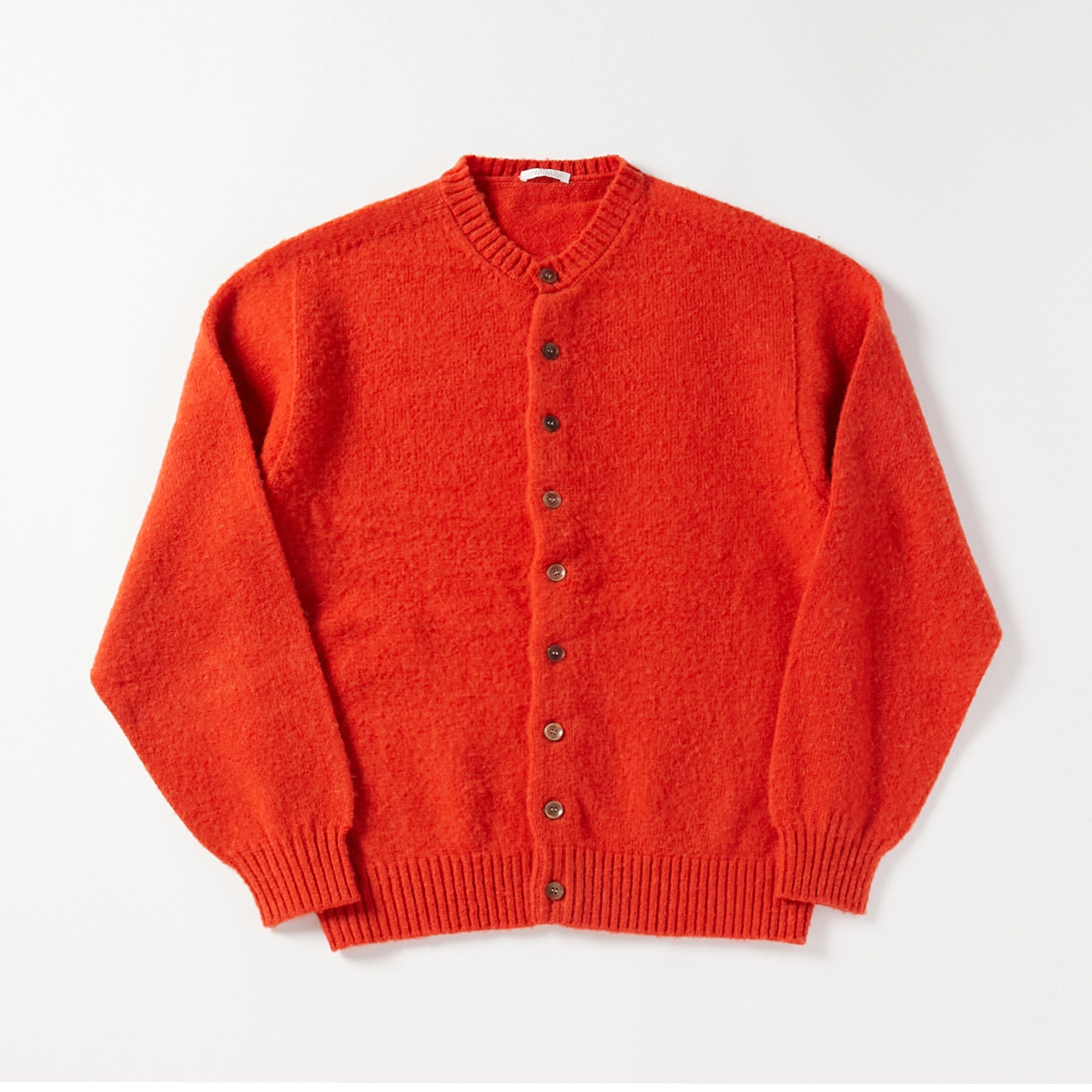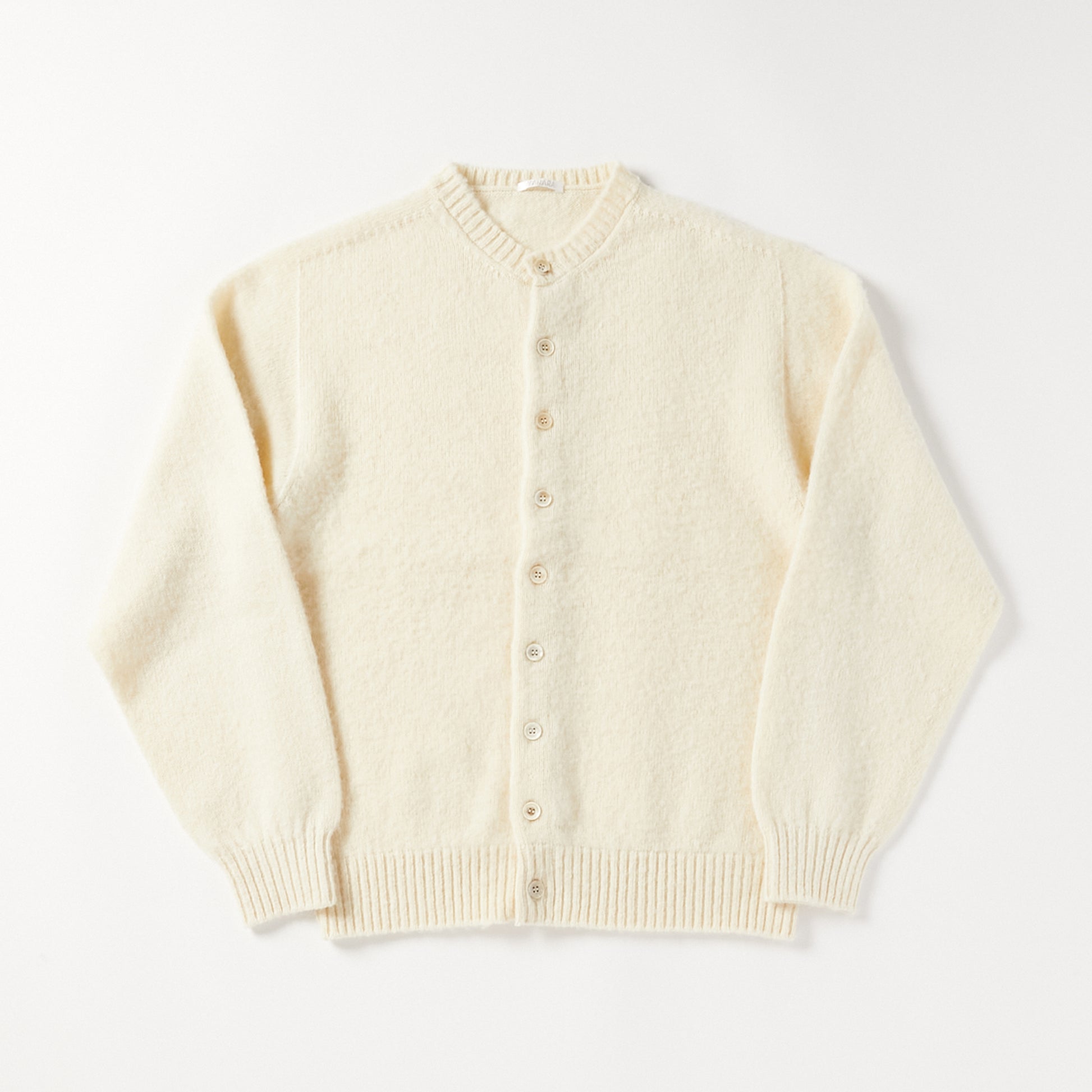 シェットランドタイプの糸を使用し、伝統的なシャギードッグ加工を施した特別なニット。 起毛によって毛羽立てられた表面は、まるで犬の毛並みのようなふわりとした質感に。 軽く、空気を含み、あたたかく─着ていくうちに毛羽が落ち着き、しっとりと身体になじんでいく、育てる楽しさのあるニット。デザインは、スコットランドの伝統を思わせる、シャギードッグ仕上げのクラシカルな丸首カーディガン。 前立てには小ぶりのボタンを等間隔にたっぷりと並べることで、愛らしさと整然とした印象を同時に与えます。