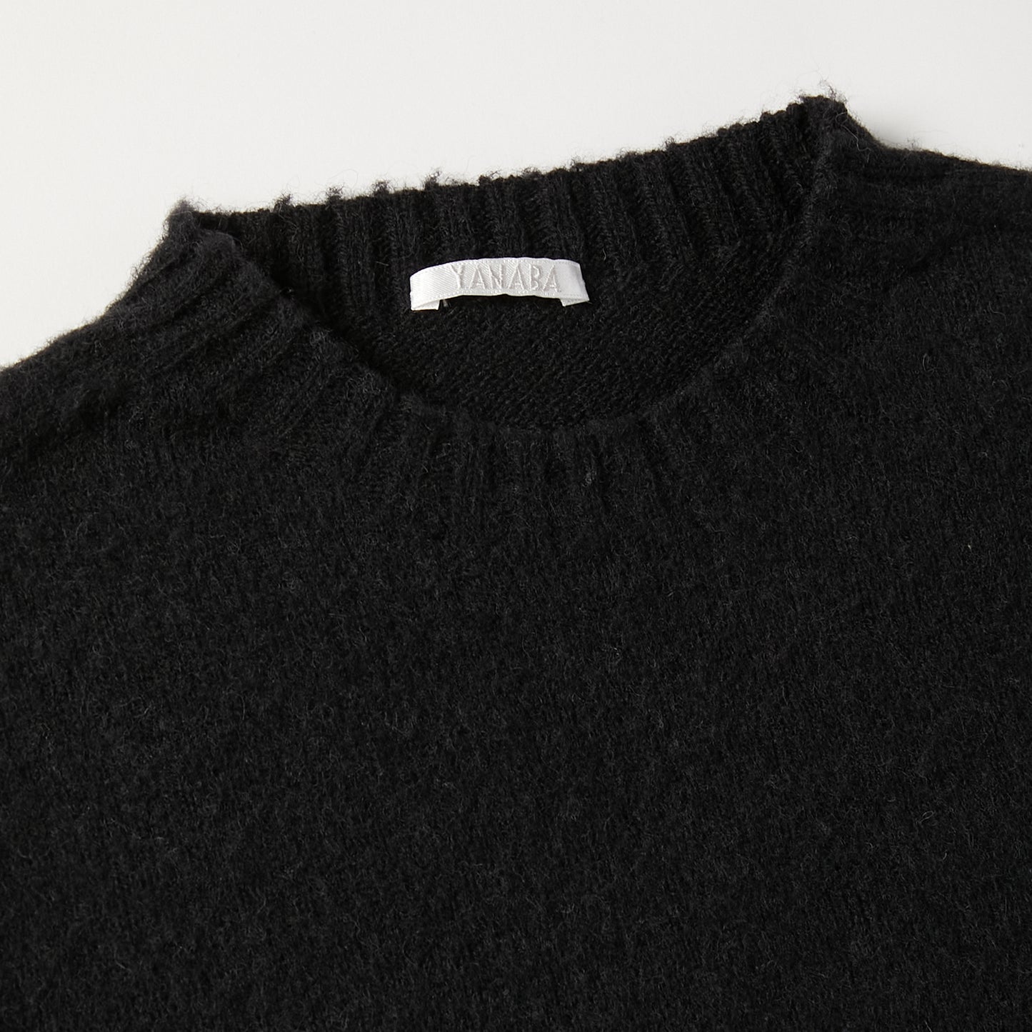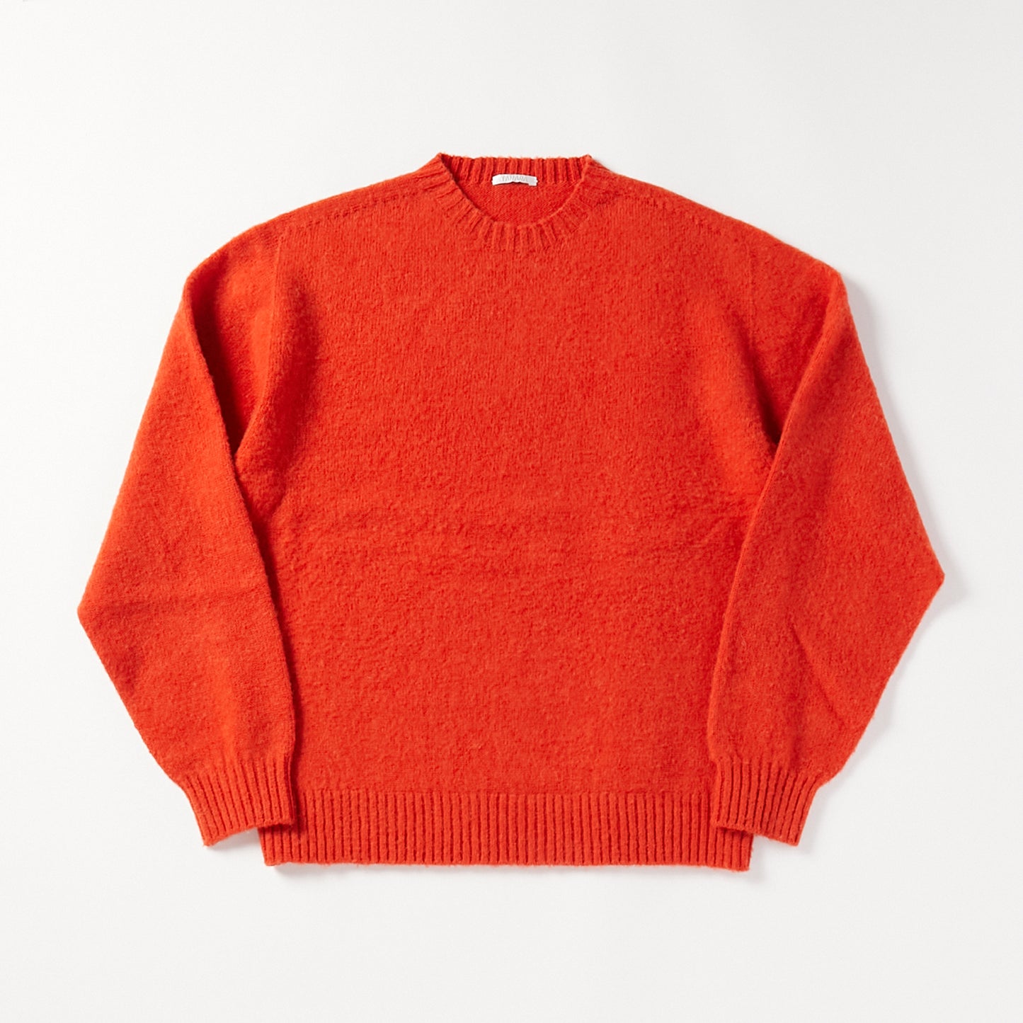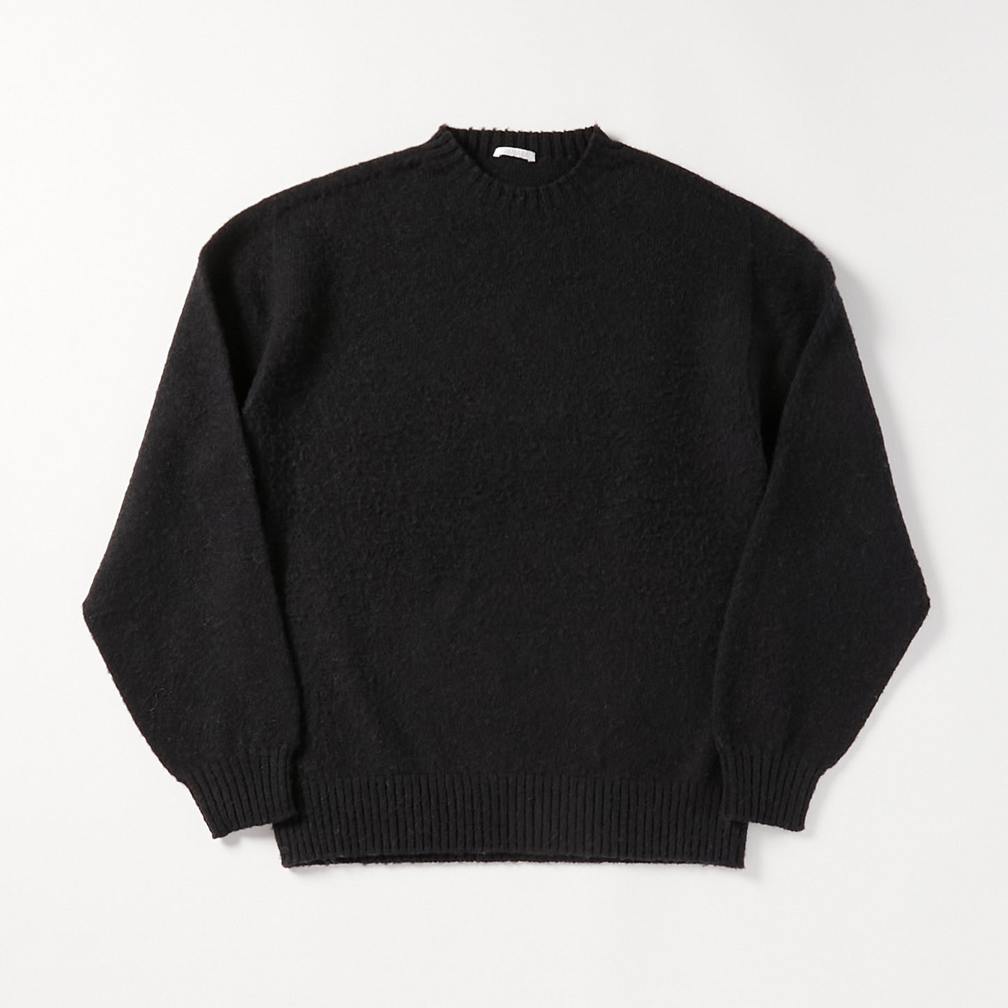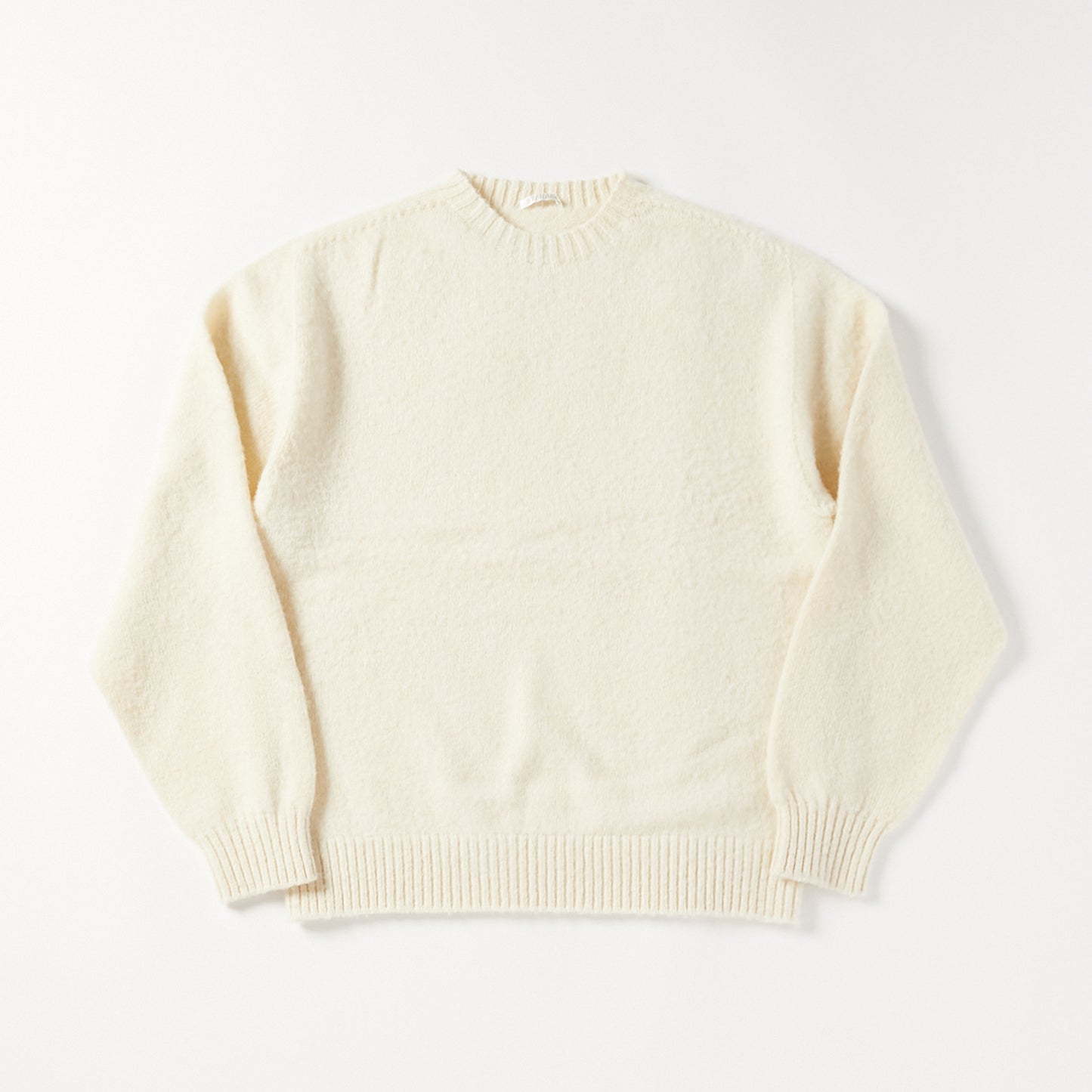 シェットランドタイプの糸を使用し、伝統的なシャギードッグ加工を施した特別なニット。 起毛によって毛羽立てられた表面は、まるで犬の毛並みのようなふわりとした質感に。 軽く、空気を含み、あたたかく─着ていくうちに毛羽が落ち着き、しっとりと身体になじんでいく、育てる楽しさのあるニット。デザインは、スコットランドの伝統を思わせる、シャギードッグ仕上げのプルオーバー。 ディテールは極力ミニマルに。 毛足の表情が際立つよう、ベーシックなクルーネックとややゆとりのあるシルエットで、日常に溶け込むデザインに仕上げました。