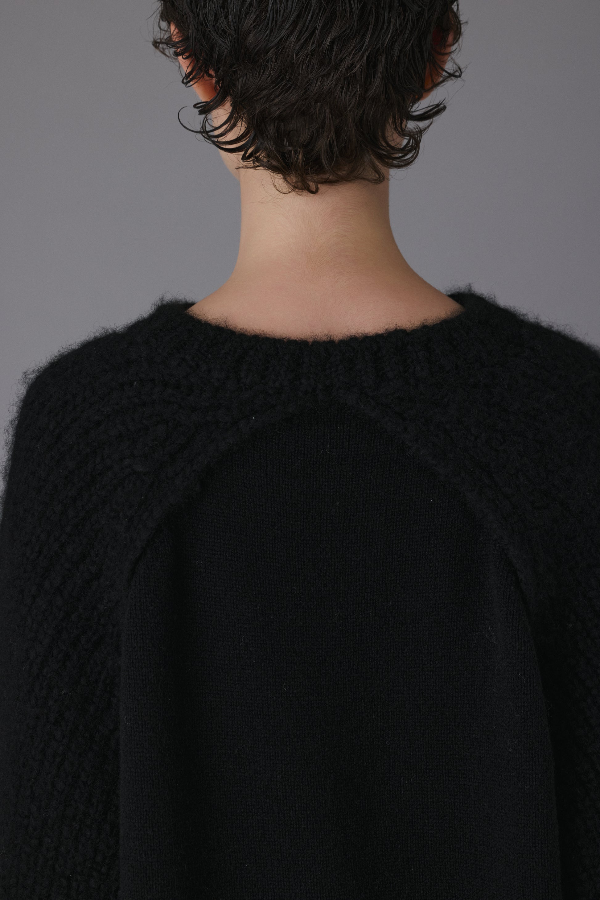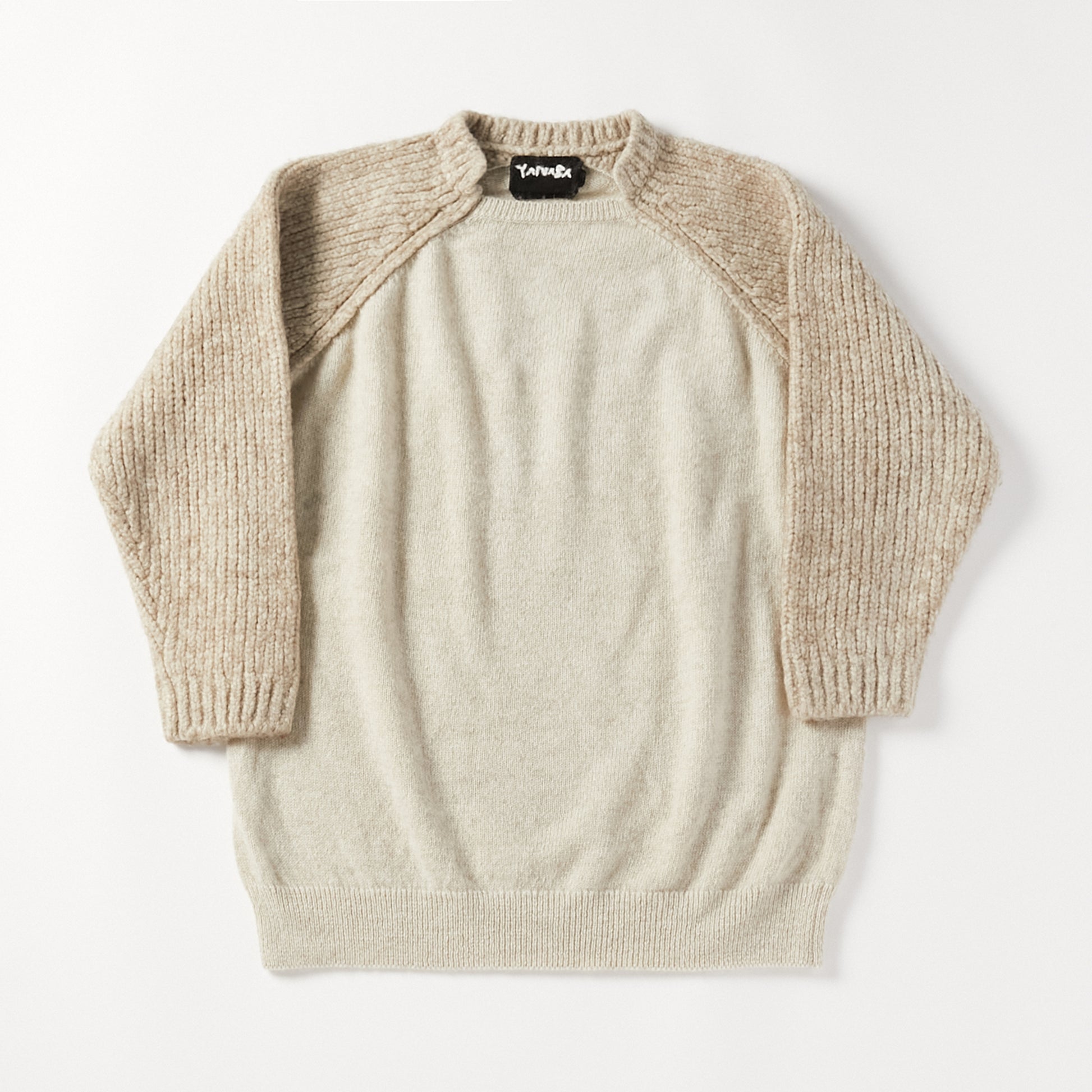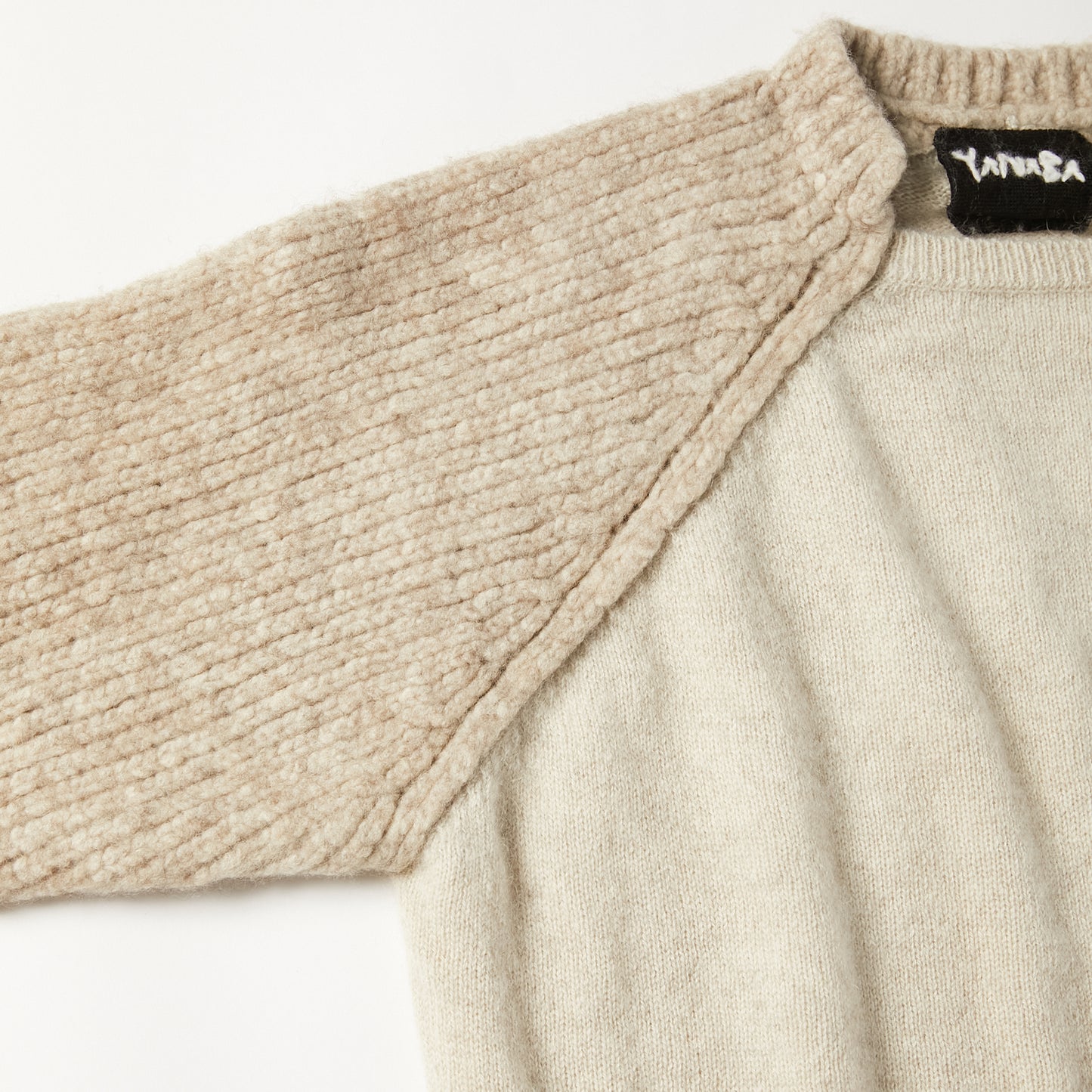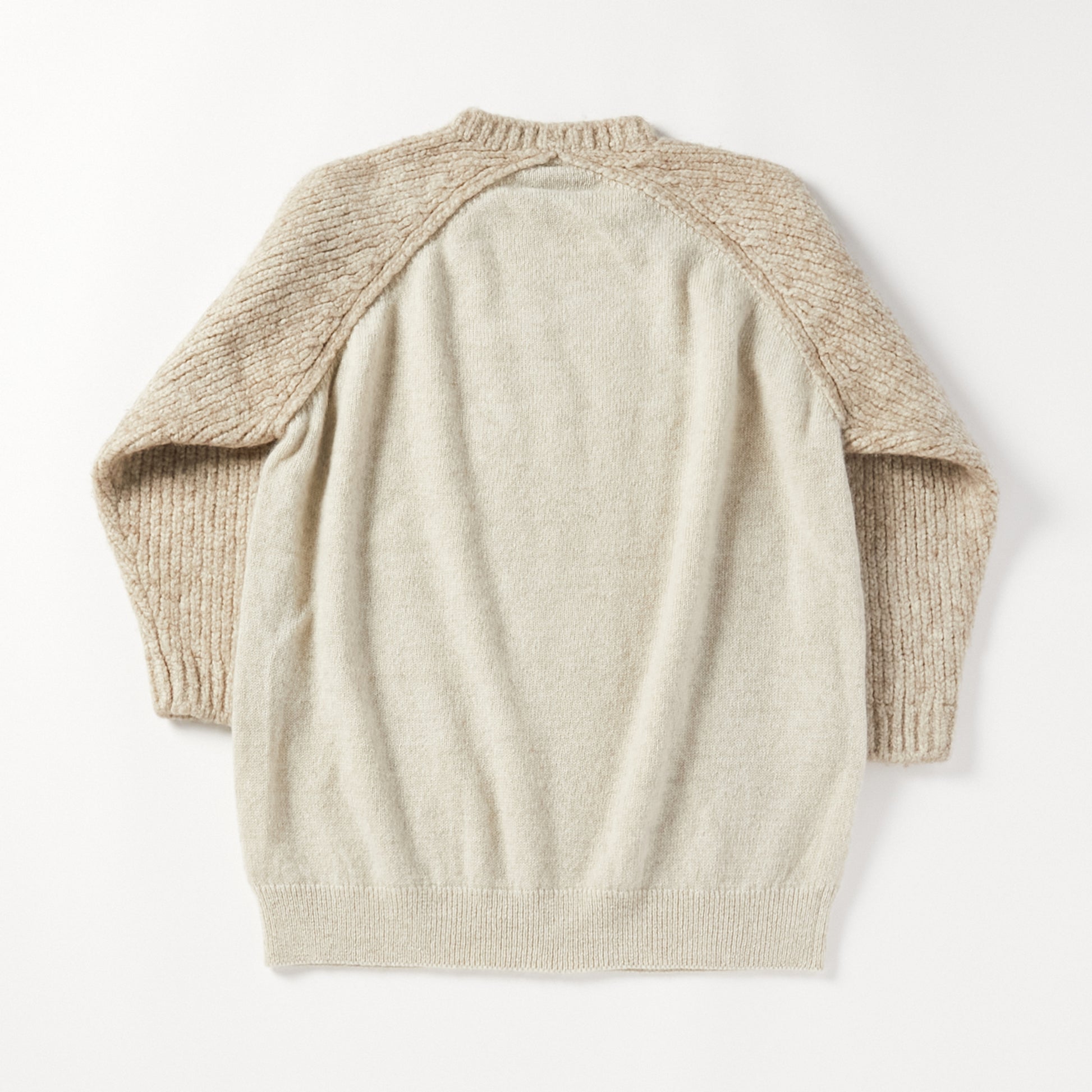 同じ素材から異なる表情を纏った、ヤクウールの重なり。 家庭機で丁寧に編み上げた、2つの個性。 使用する糸はすべてヤクウール100%。 ふんわりと空気を含むブークレ加工を施したロービング糸と、しっとりと繊細な細番手のヤク糸。 この二つの異なる質感を、パーツごとに使い分けることで、一枚に奥行きと立体感を宿しました。 いずれも家庭機編みによる、ゆっくりと丁寧なものづくりです。レイヤードしているような佇まいを一枚で表現。 身頃には細番手ヤク、袖にはロービングヤクを使用した、異素材感が映えるニットです。 ワイドなシルエットで、ジェンダーを問わず着用可能。 空気を含んだような柔らかさと、品のある落ち着きが魅力です。