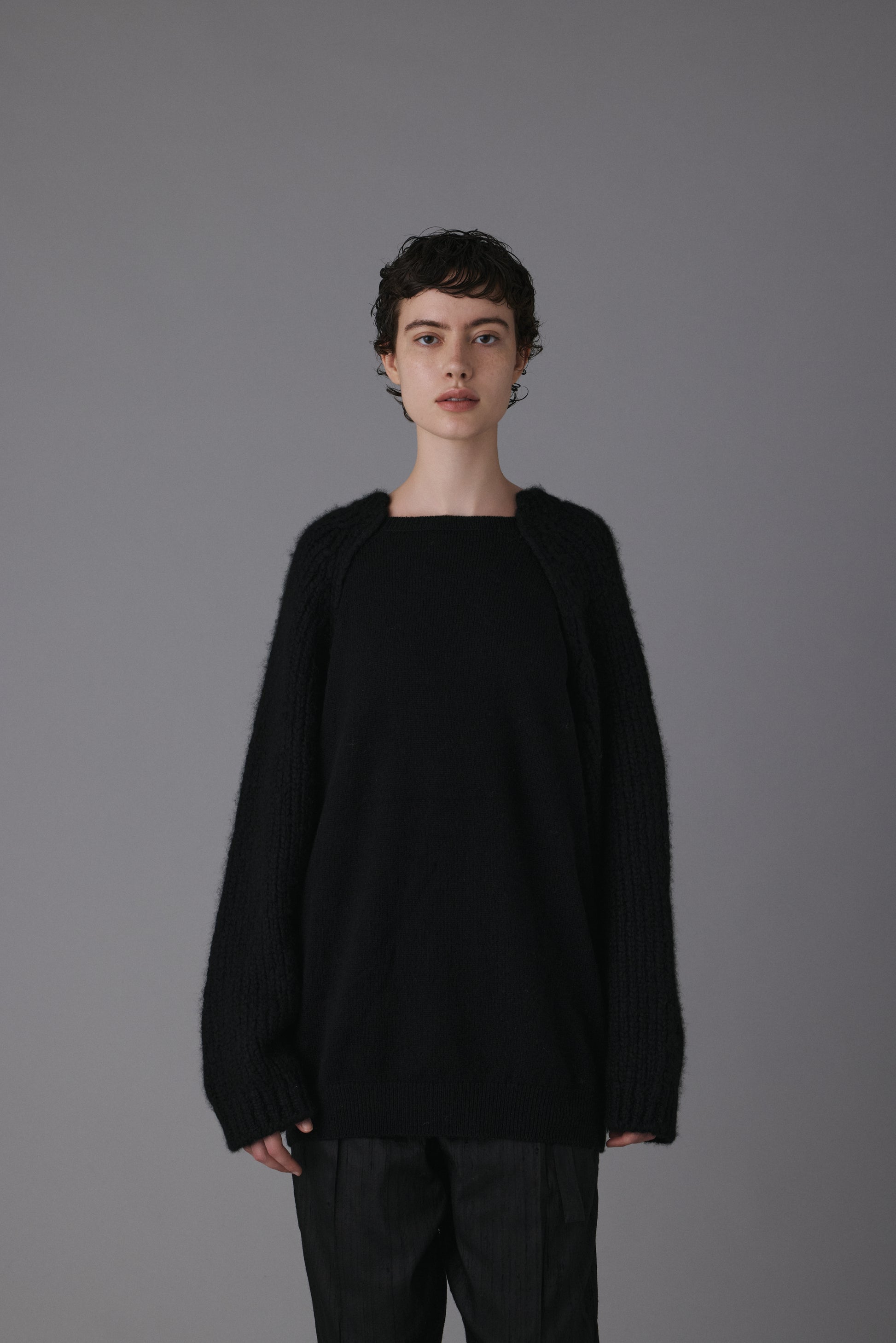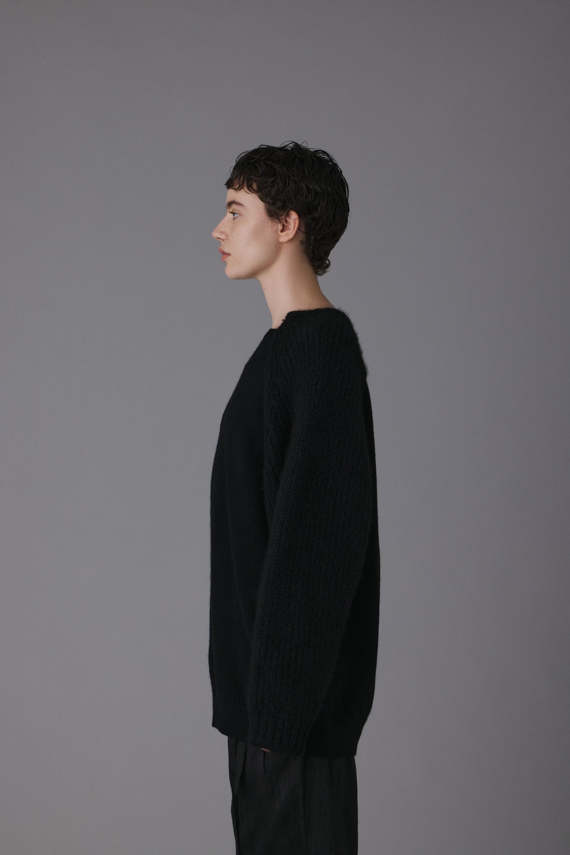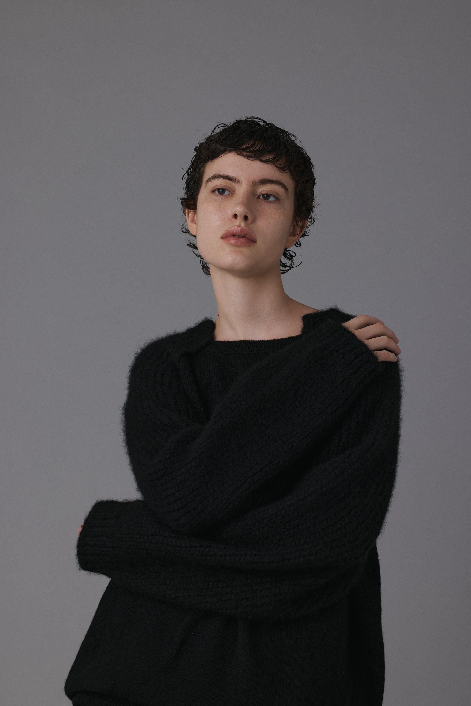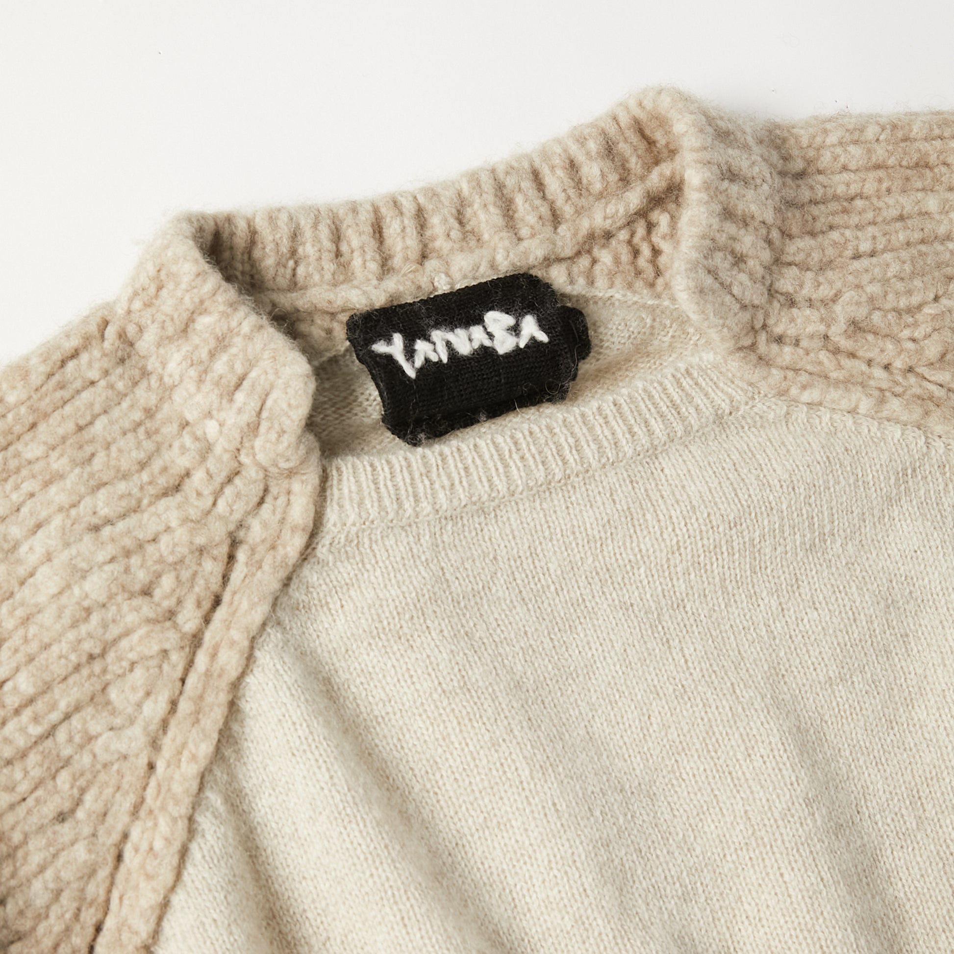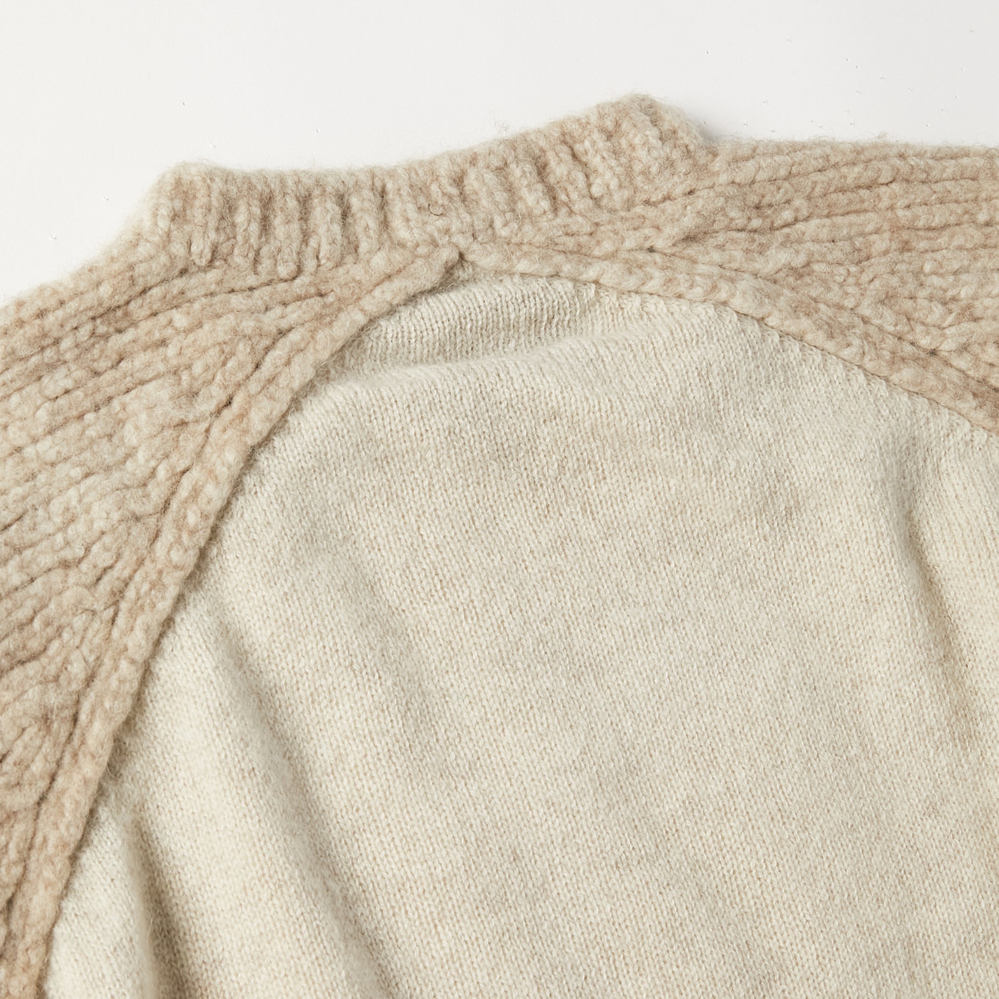 同じ素材から異なる表情を纏った、ヤクウールの重なり。 家庭機で丁寧に編み上げた、2つの個性。 使用する糸はすべてヤクウール100%。 ふんわりと空気を含むブークレ加工を施したロービング糸と、しっとりと繊細な細番手のヤク糸。 この二つの異なる質感を、パーツごとに使い分けることで、一枚に奥行きと立体感を宿しました。 いずれも家庭機編みによる、ゆっくりと丁寧なものづくりです。レイヤードしているような佇まいを一枚で表現。 身頃には細番手ヤク、袖にはロービングヤクを使用した、異素材感が映えるニットです。 ワイドなシルエットで、ジェンダーを問わず着用可能。 空気を含んだような柔らかさと、品のある落ち着きが魅力です。