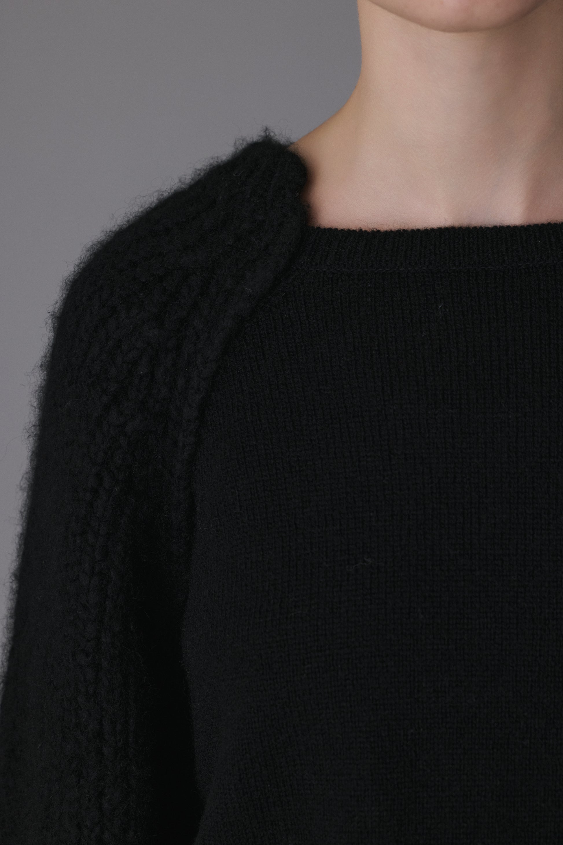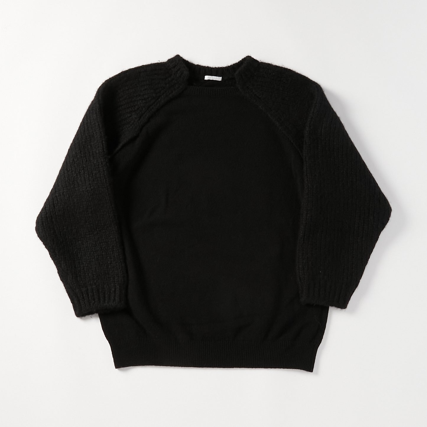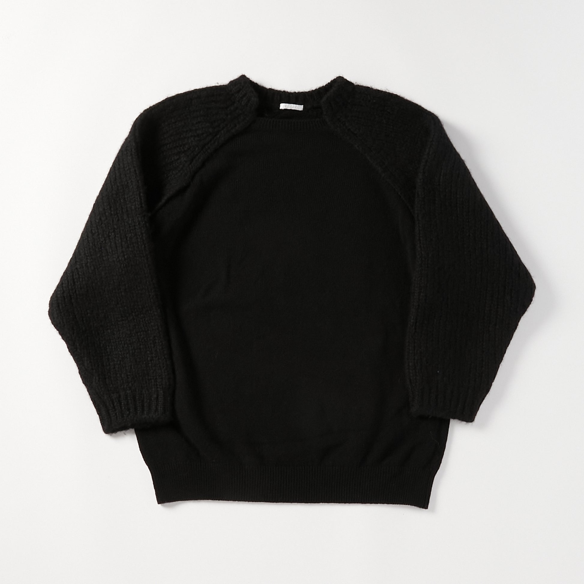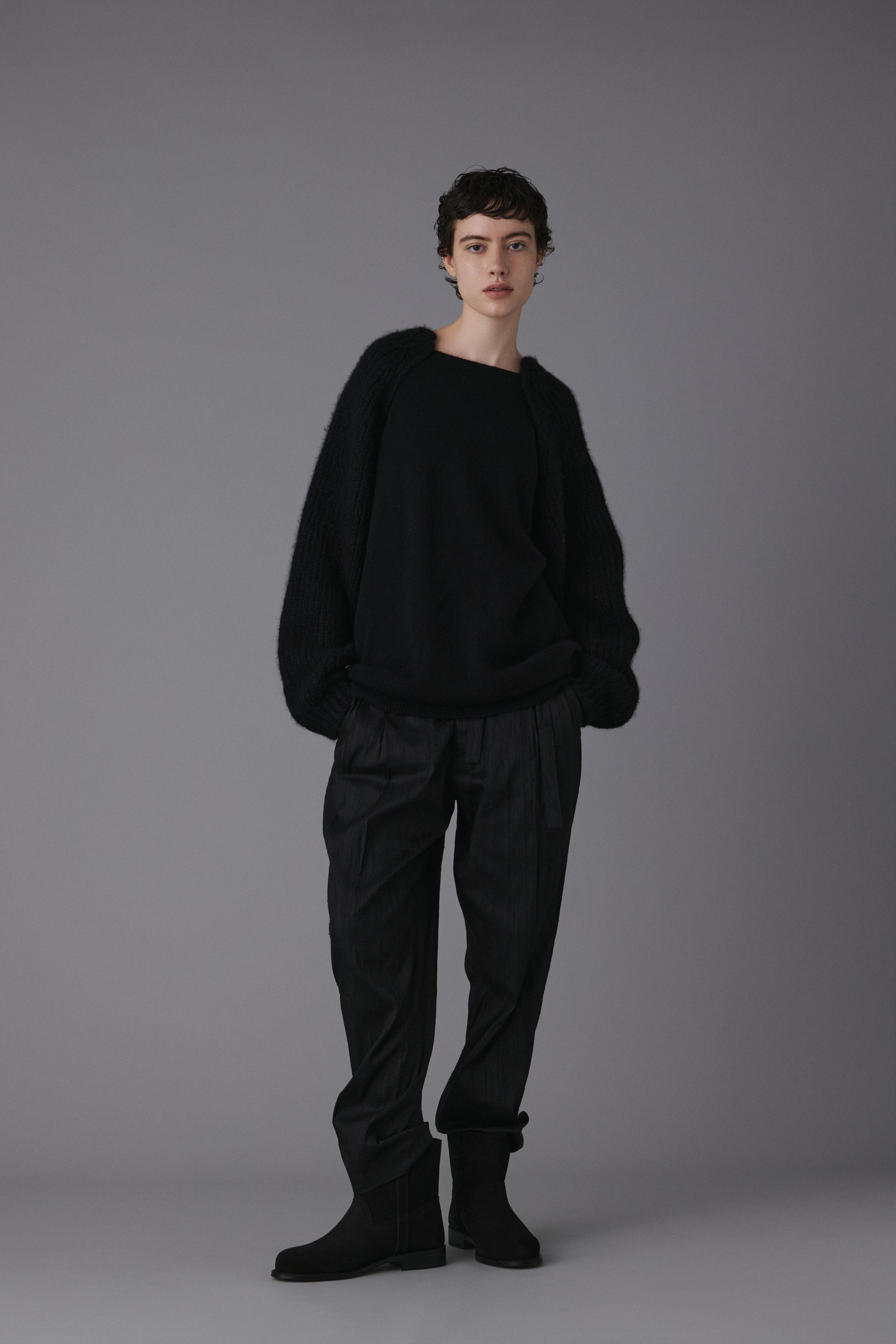 同じ素材から異なる表情を纏った、ヤクウールの重なり。 家庭機で丁寧に編み上げた、2つの個性。 使用する糸はすべてヤクウール100%。 ふんわりと空気を含むブークレ加工を施したロービング糸と、しっとりと繊細な細番手のヤク糸。 この二つの異なる質感を、パーツごとに使い分けることで、一枚に奥行きと立体感を宿しました。 いずれも家庭機編みによる、ゆっくりと丁寧なものづくりです。レイヤードしているような佇まいを一枚で表現。 身頃には細番手ヤク、袖にはロービングヤクを使用した、異素材感が映えるニットです。 ワイドなシルエットで、ジェンダーを問わず着用可能。 空気を含んだような柔らかさと、品のある落ち着きが魅力です。