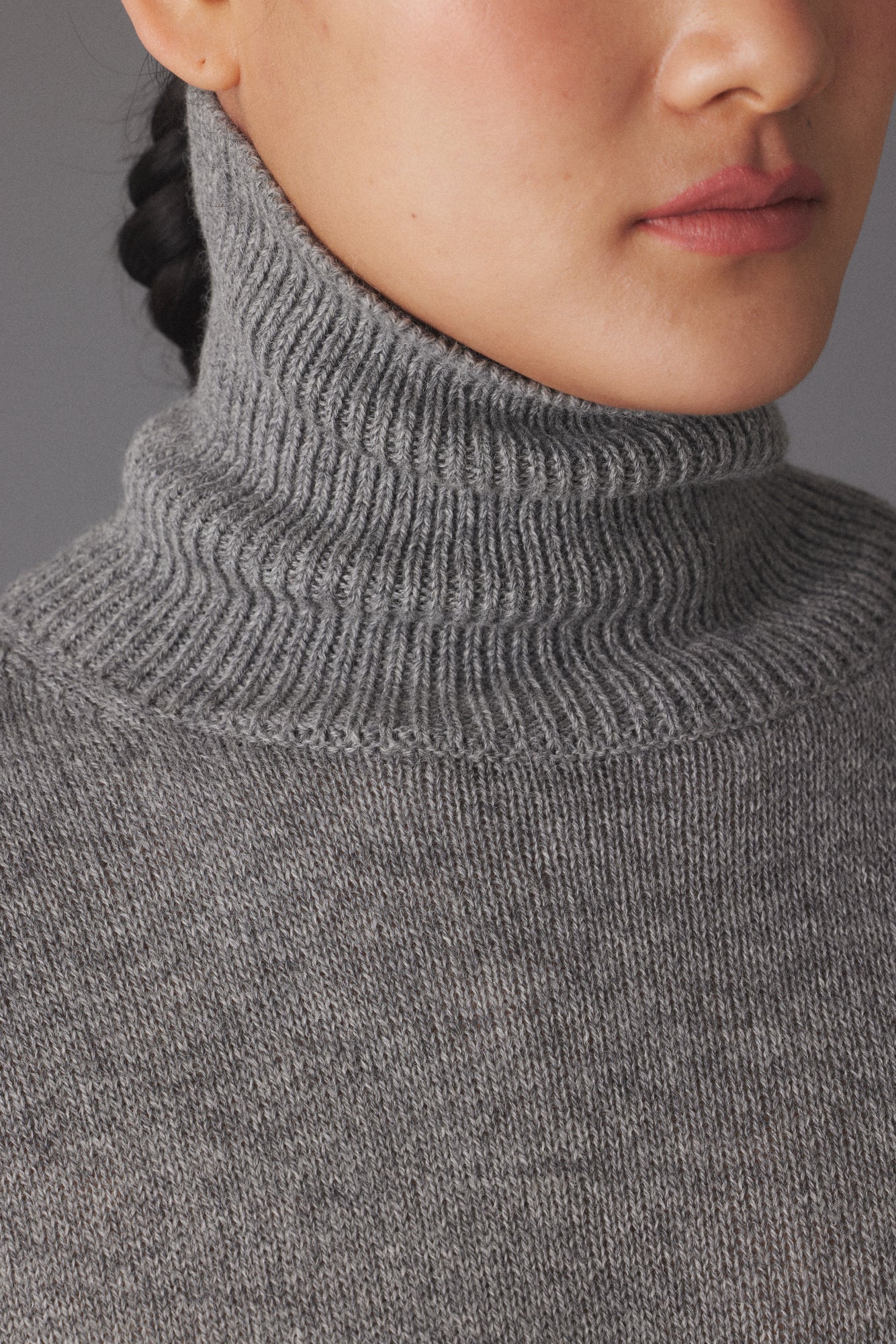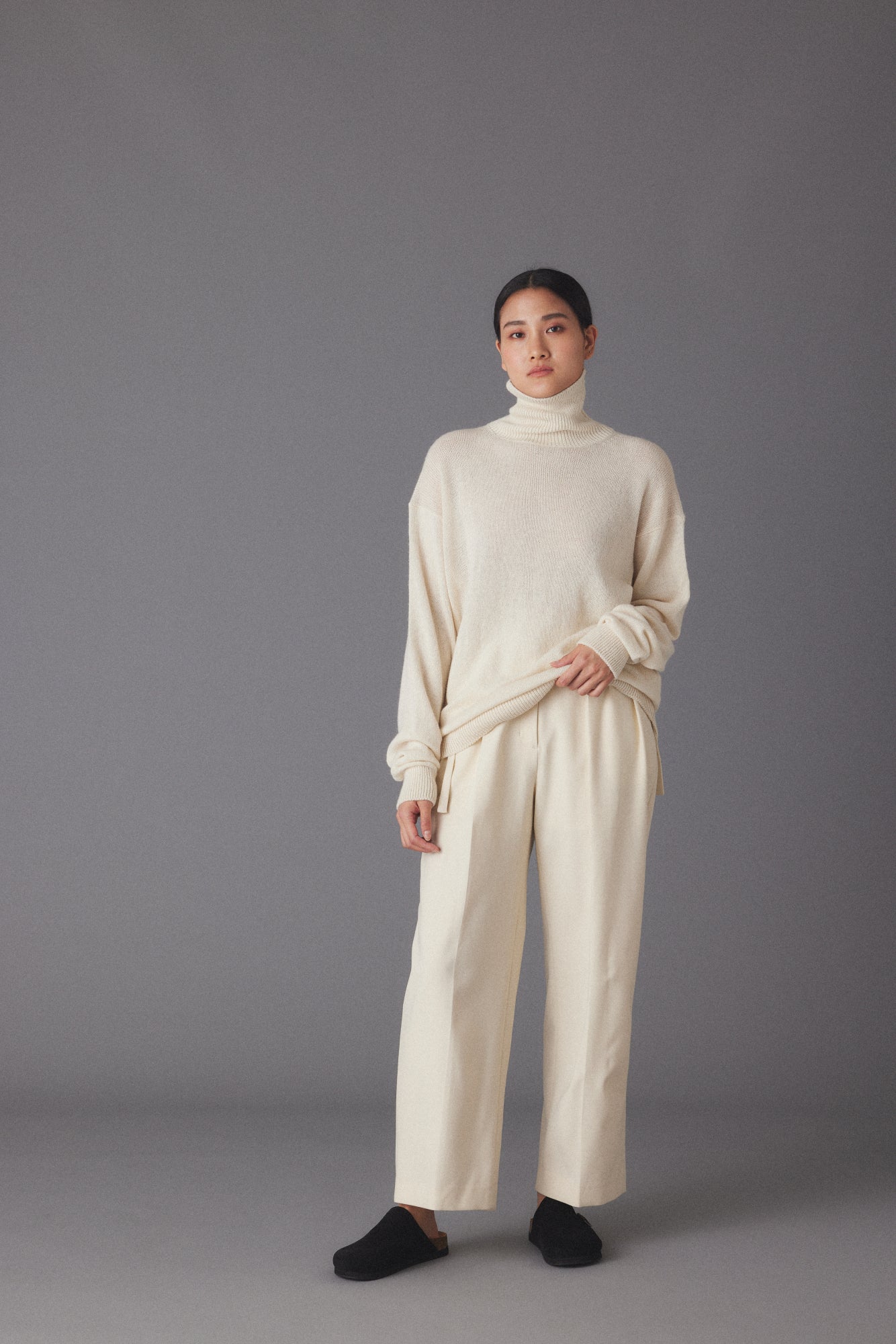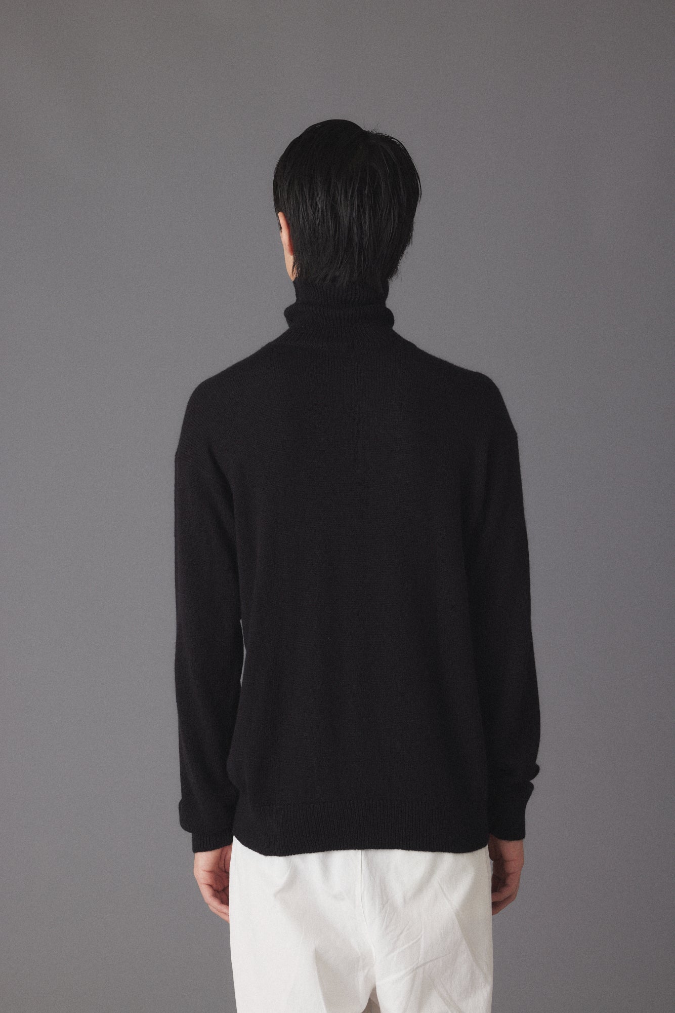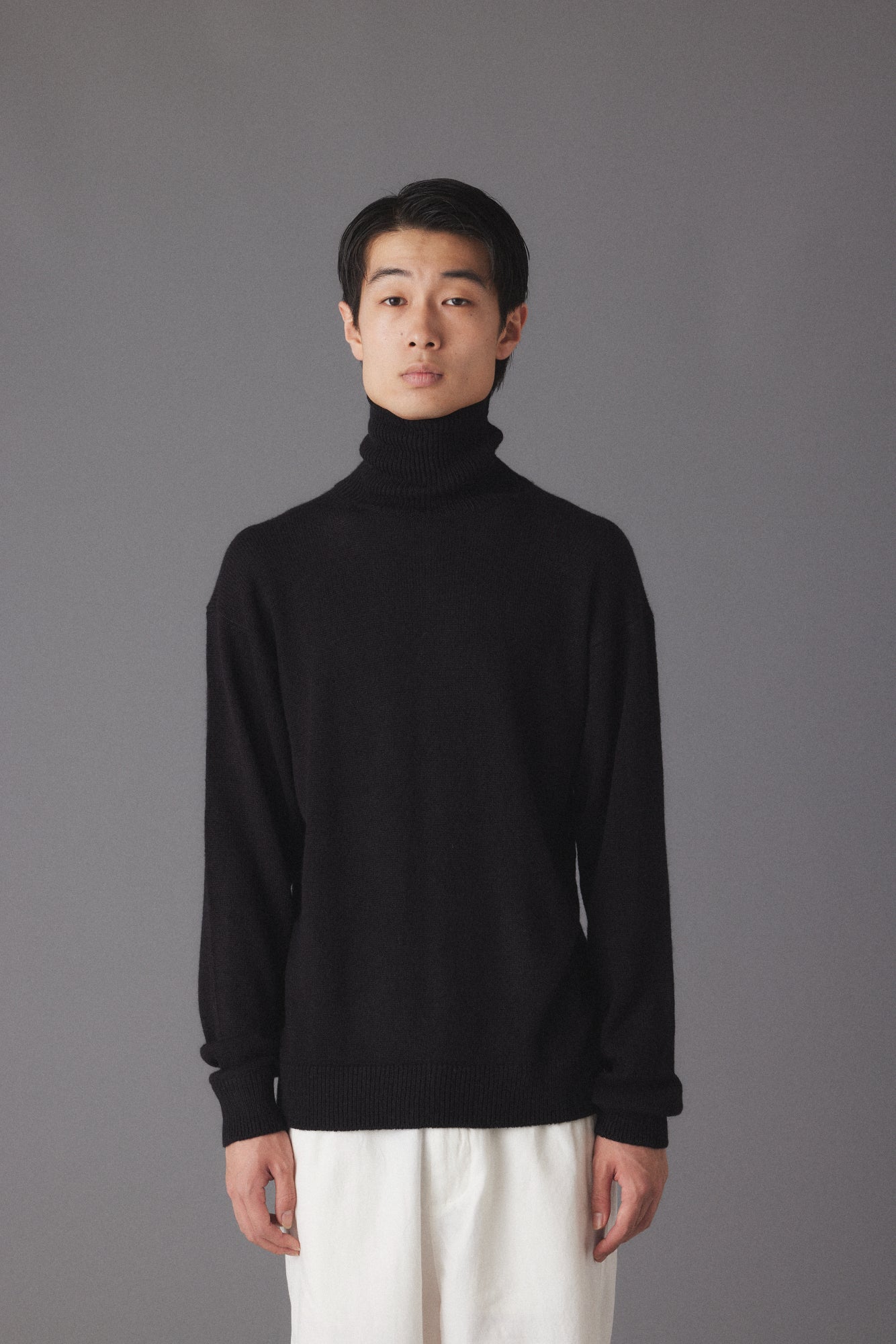 ややゆったりとしたシルエットで編み上げたタートルネックのプルオーバーデザイン。