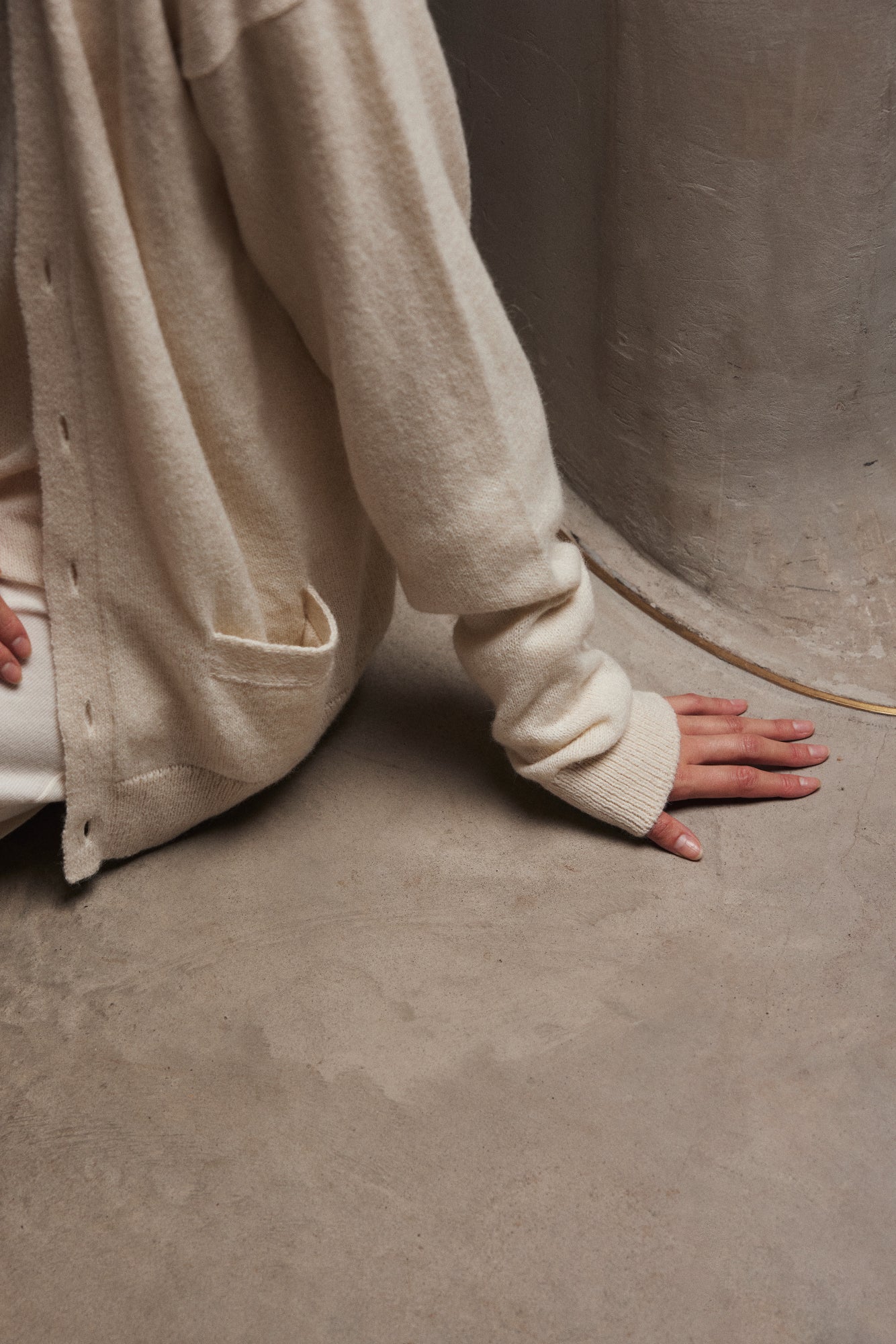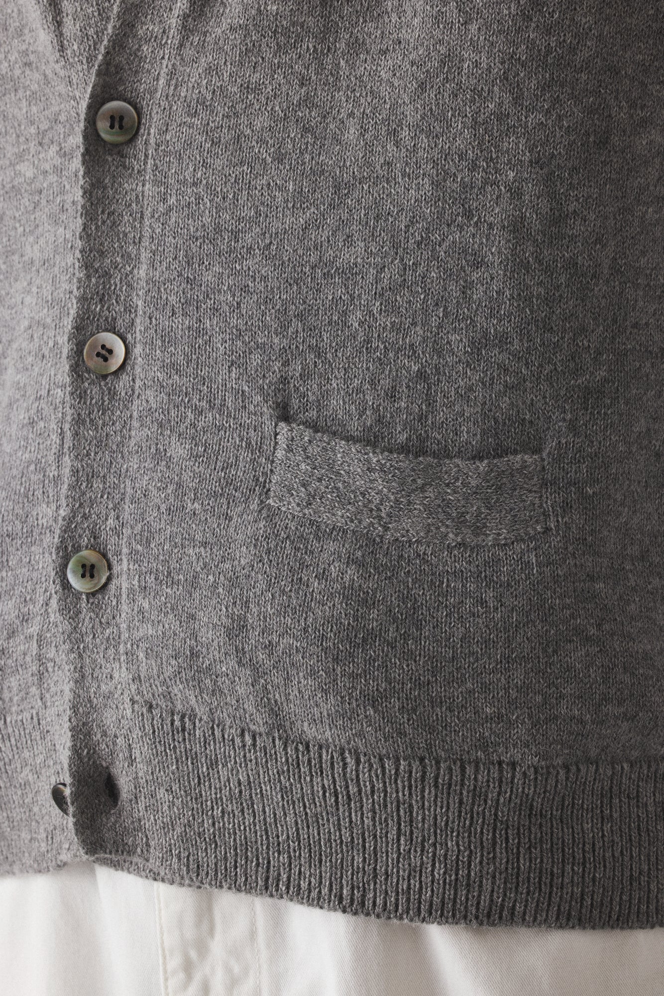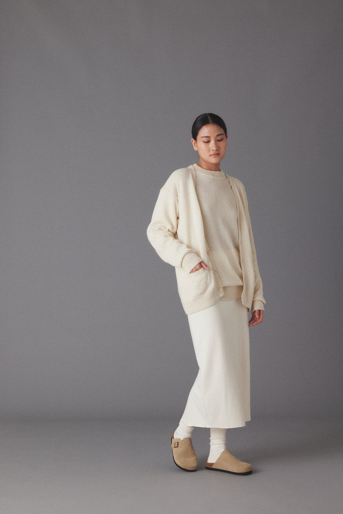 ややゆったりとしたシルエットで編み上げたVネックカーディガン。
