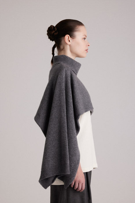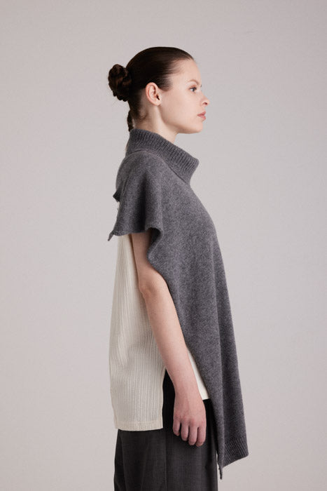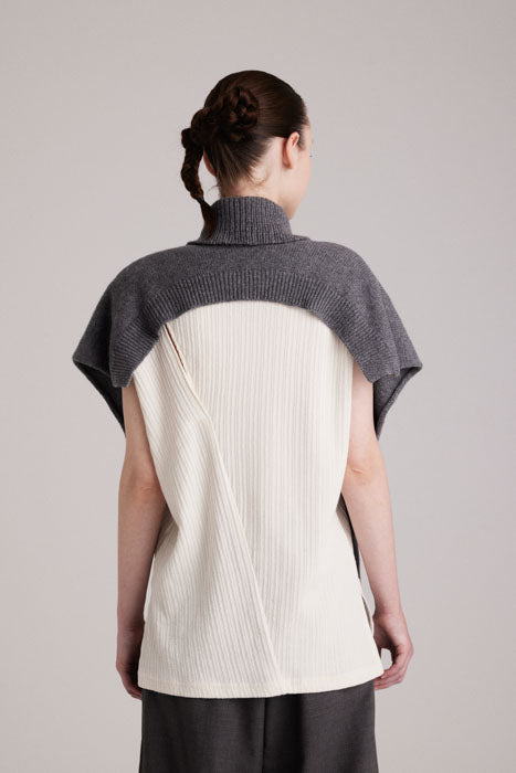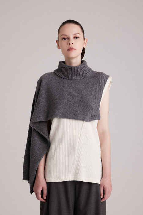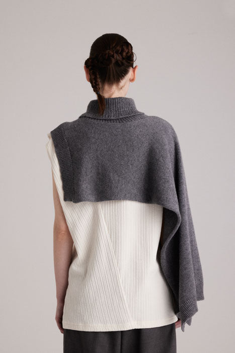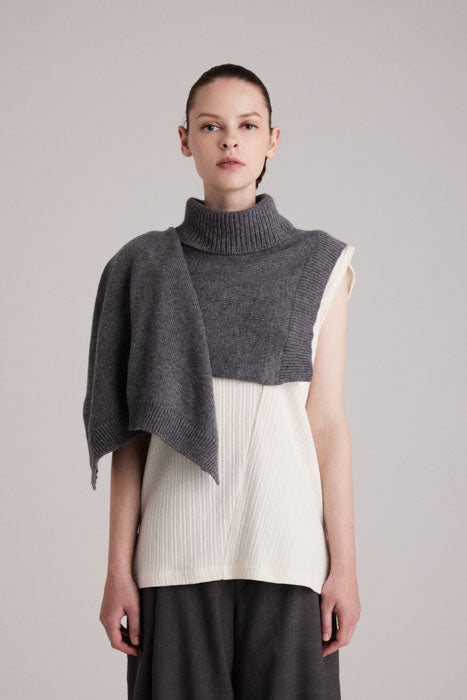 左右・前後の不対象のスクエアデザインは、回転する/巻く/垂らす/ベスト型やストールなど様々に変化するバ リエーションアイテム。