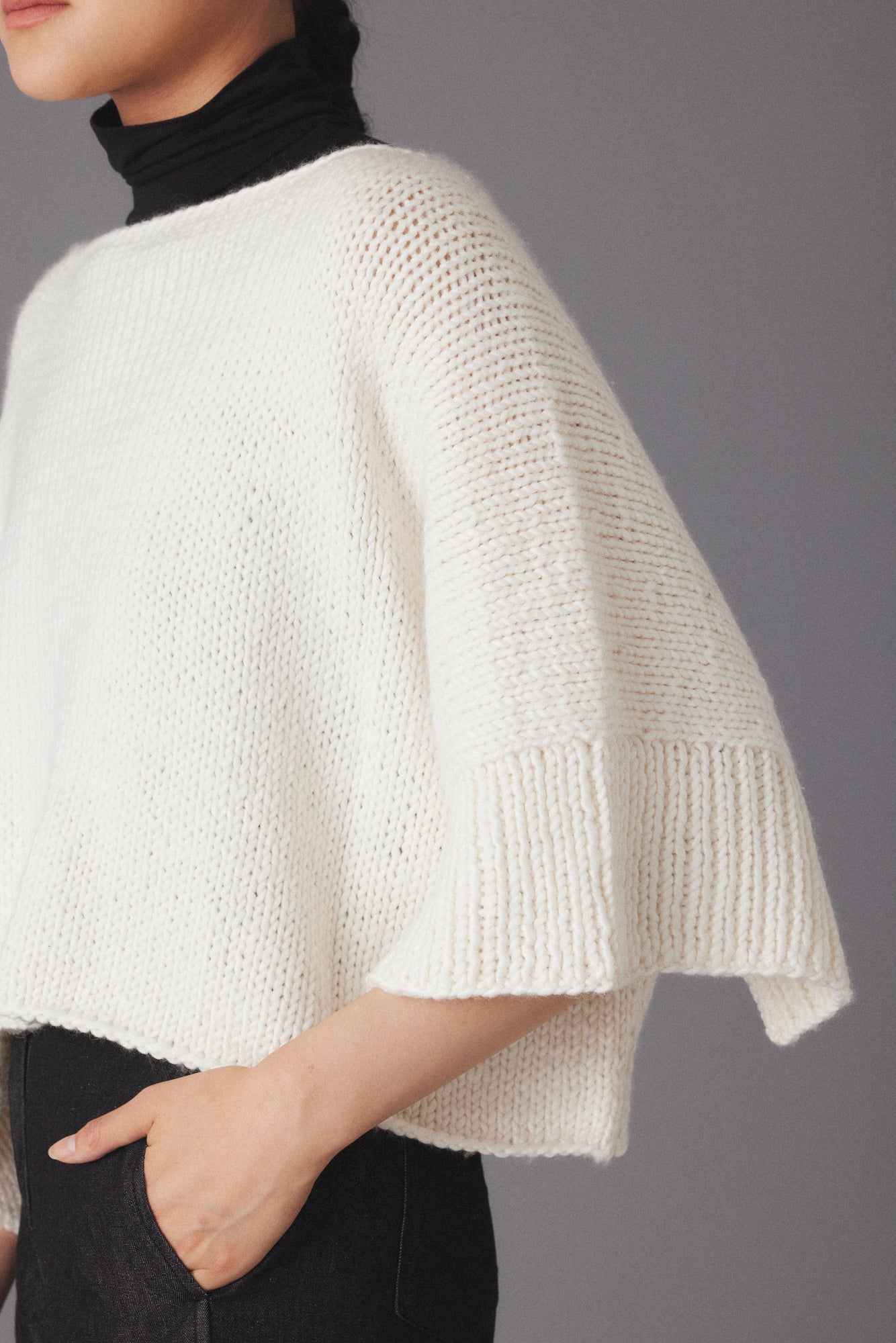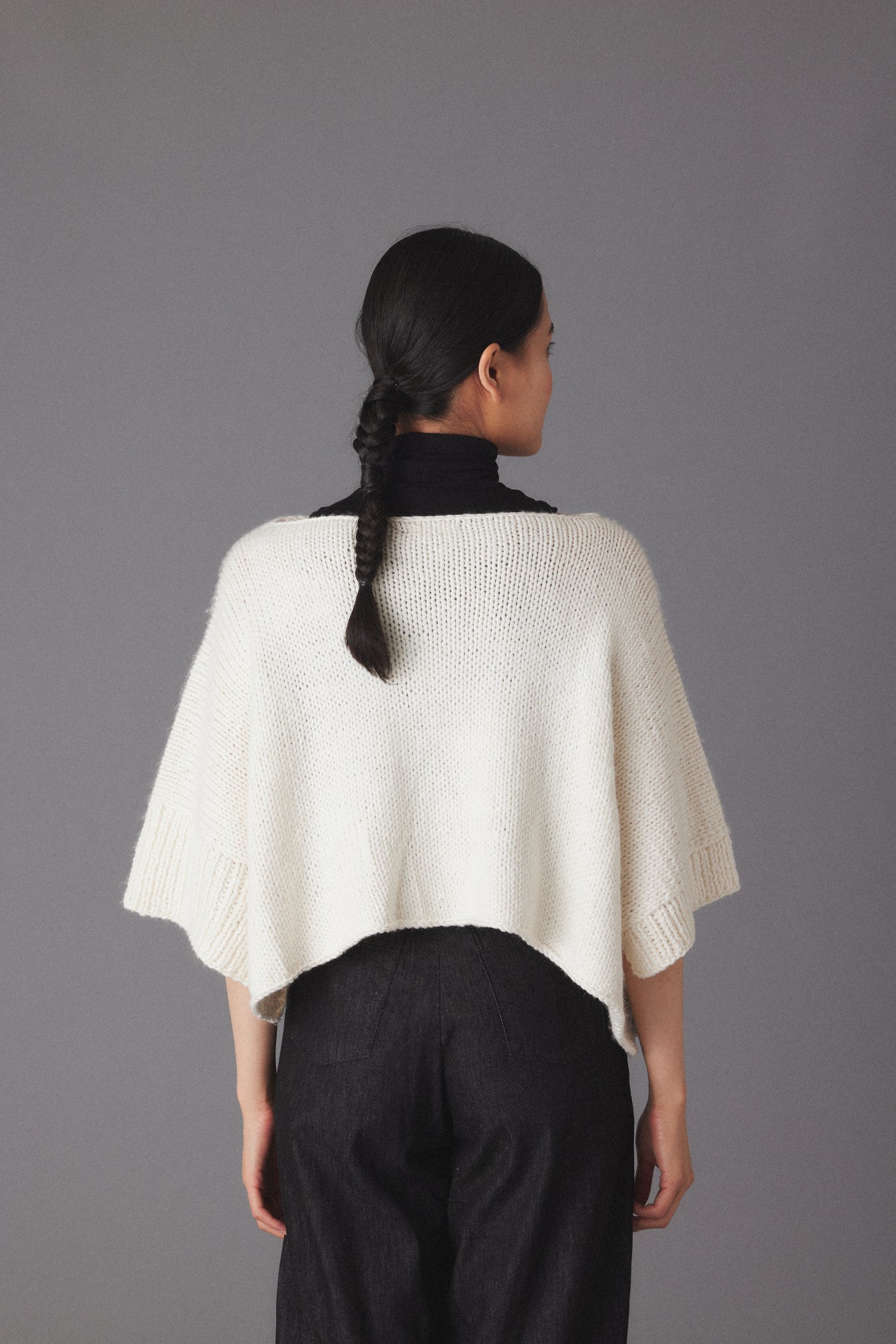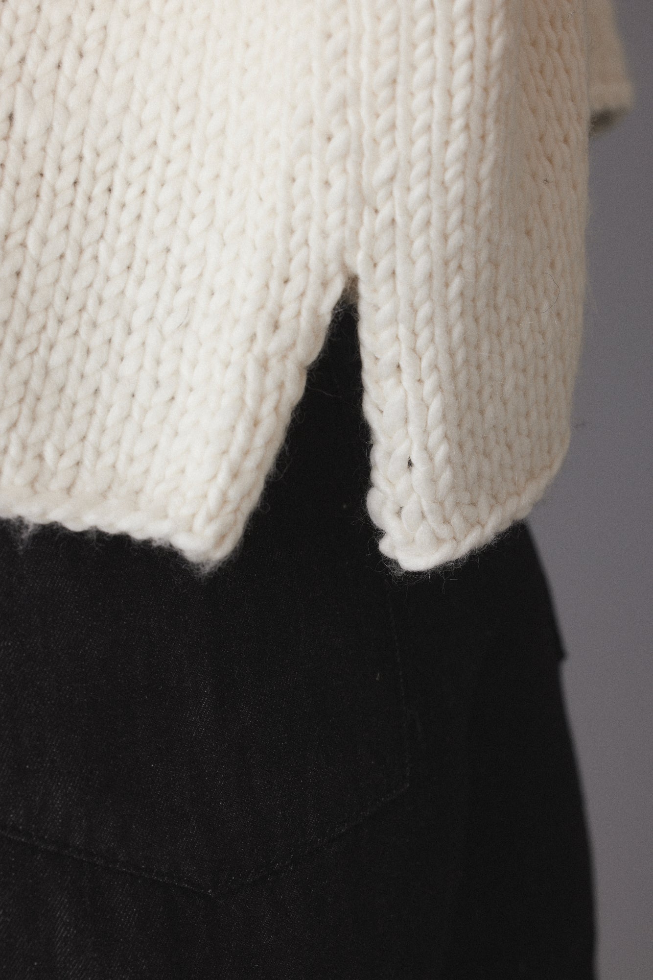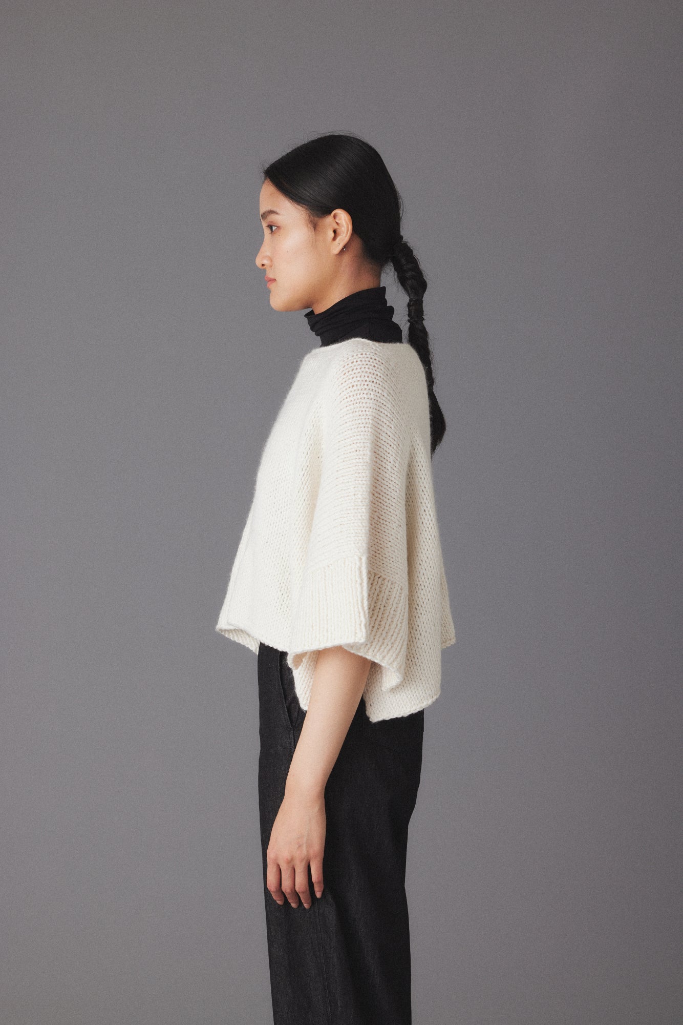 そこに柞蚕(さくさん)などの山繭蛾(やままゆが)から採れるタッサーシルクを混ぜて作られた糸は、通常の絹よりもハリがあり、自然なネップ感があるのも特徴の1つ。その絹糸は空気を含み、保温・保湿性に優れています。さらに、カシミヤを加えることで、風合いを引き上げそれぞれの素材の特徴を感じながらロービングの膨らみを活かし、手編みならではの独特な風合いに。