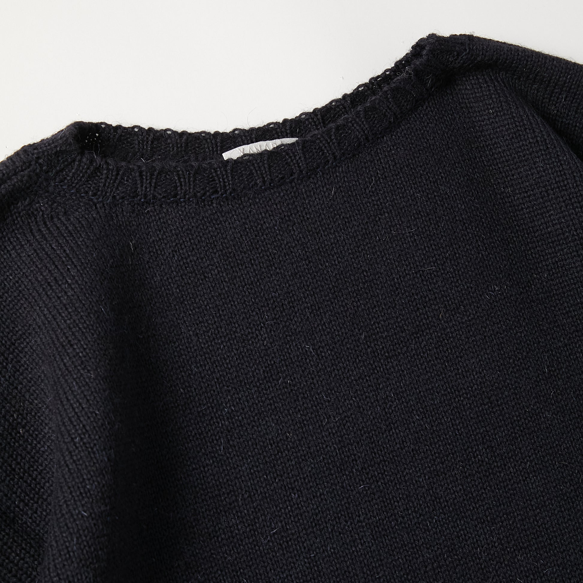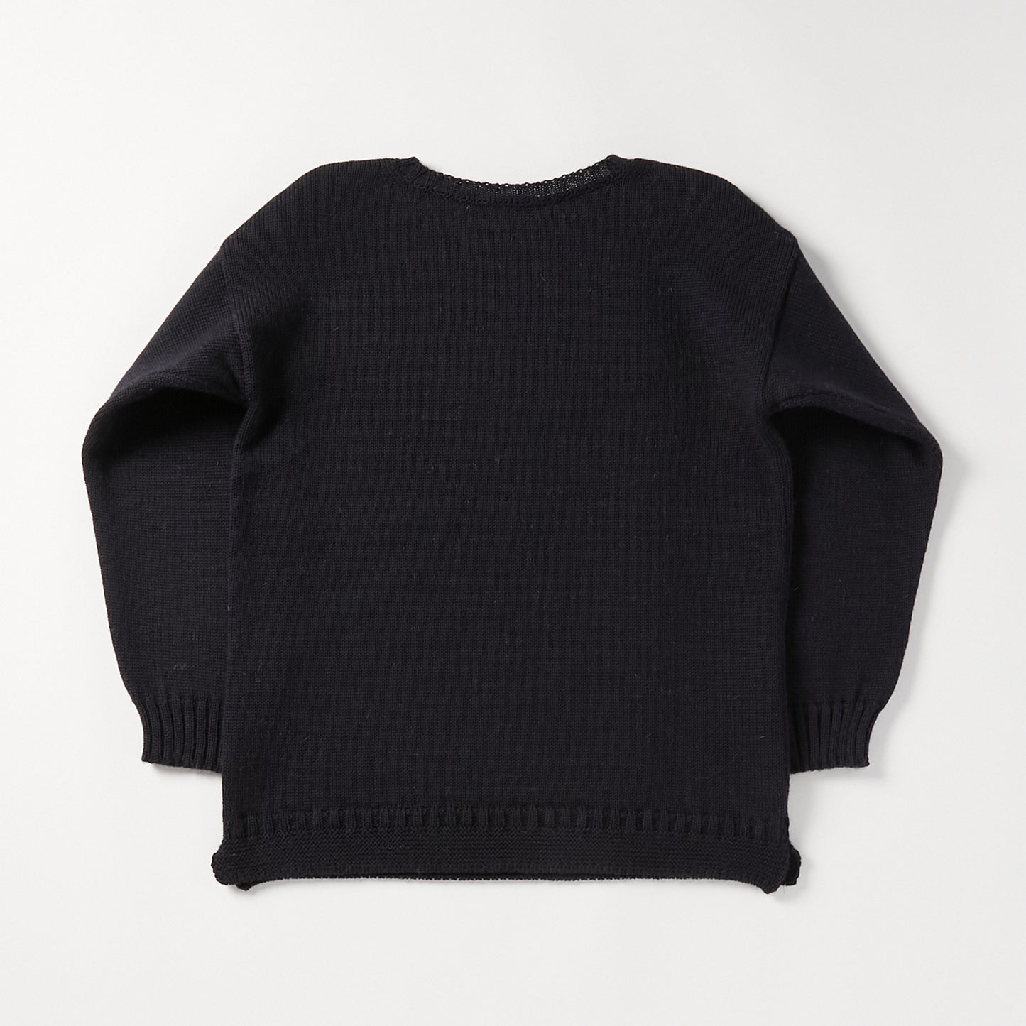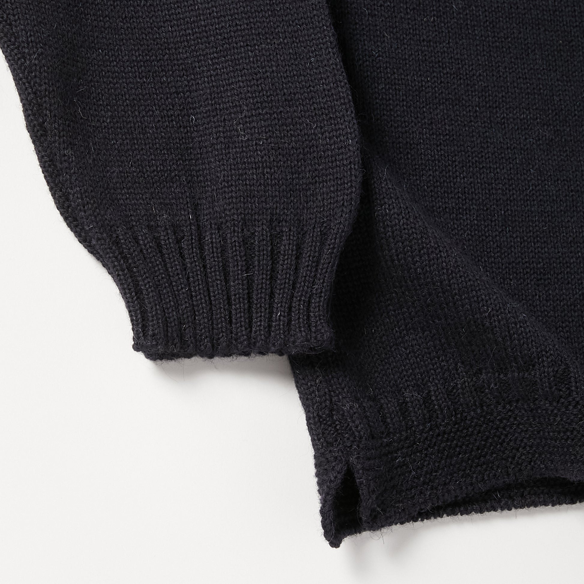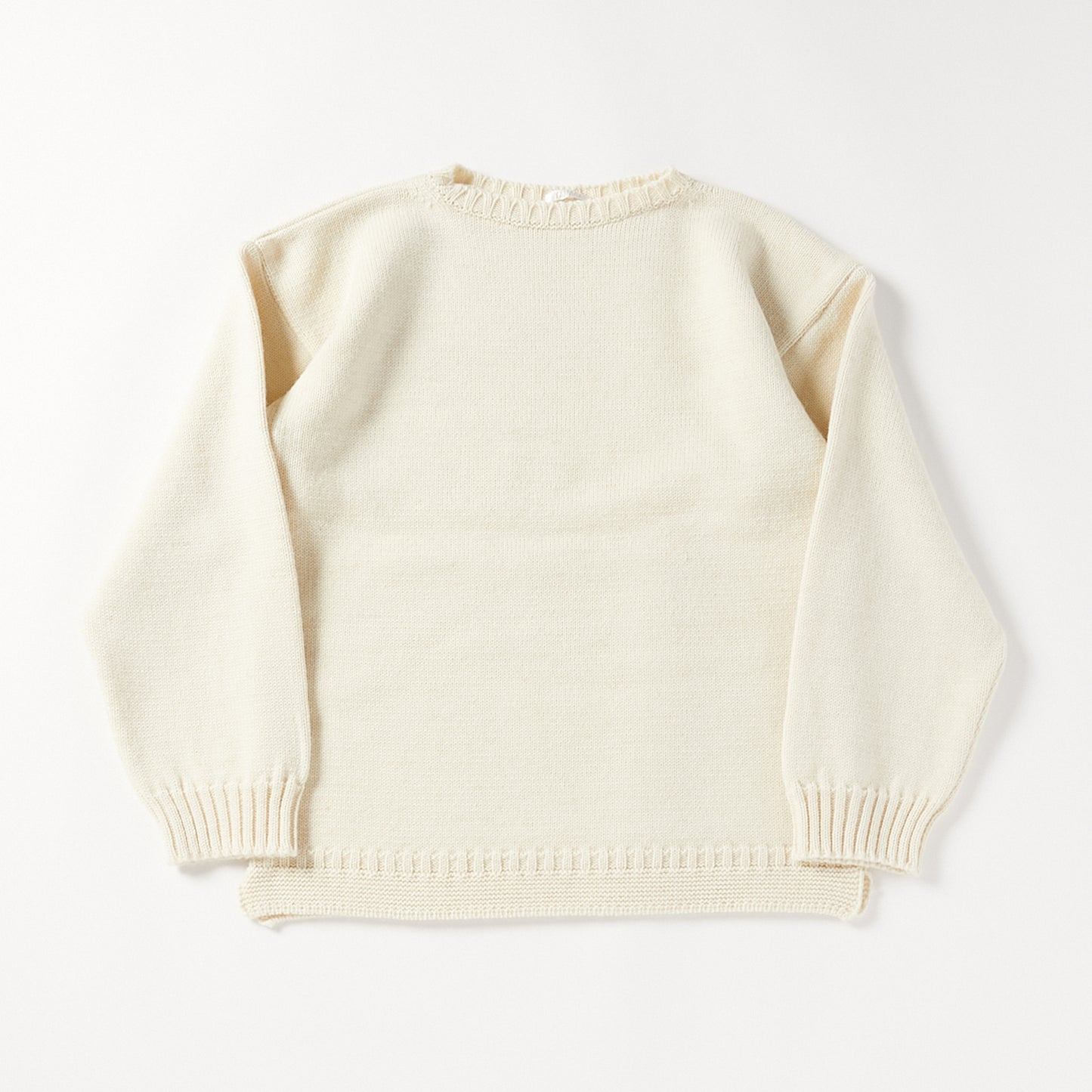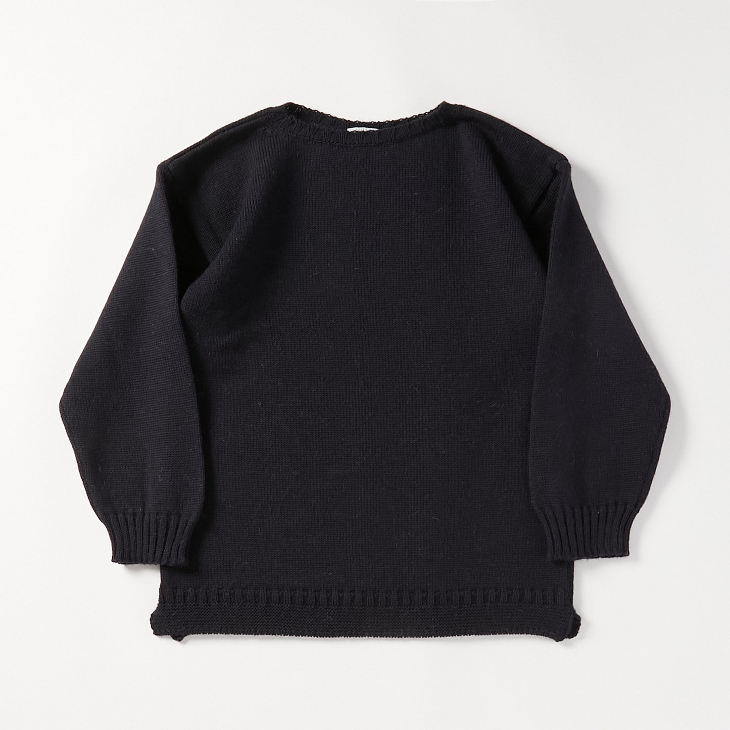 使用しているのは、英国羊毛100%。 しっかりとしたハリとコシ、風を遮るような密度感。着込むほどに身体になじみ、長く着ることで育つ一着です。 伝統的な意匠を日常に落とし込んだ、ガンジーセーター。漁師たちの防寒着として親しまれてきたガンジーセーターを、現代の装いに寄り添うベーシックに仕立てました。前後を問わないシンメトリーなデザインは、実用性と造形美を兼ね備えた伝統のディテールです。