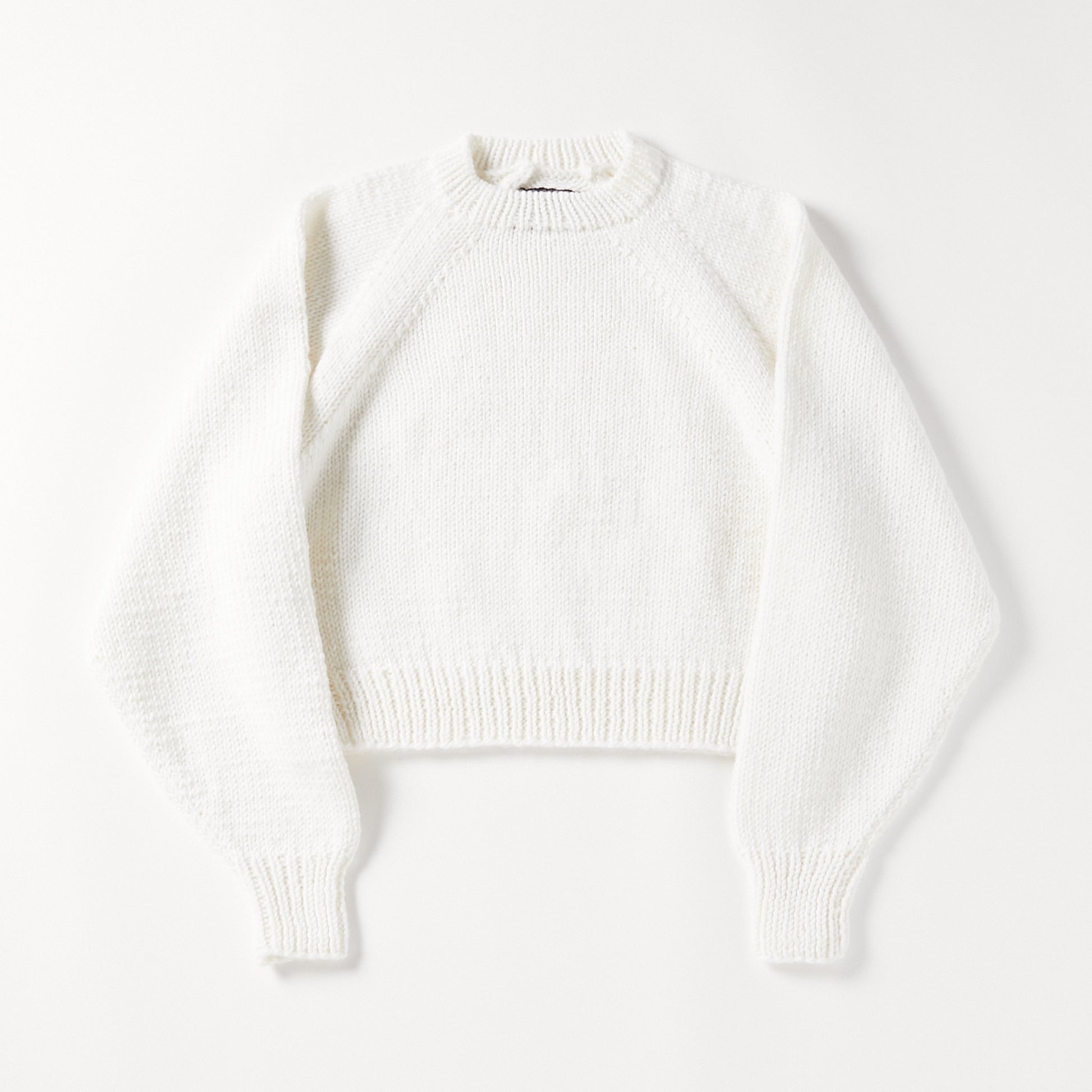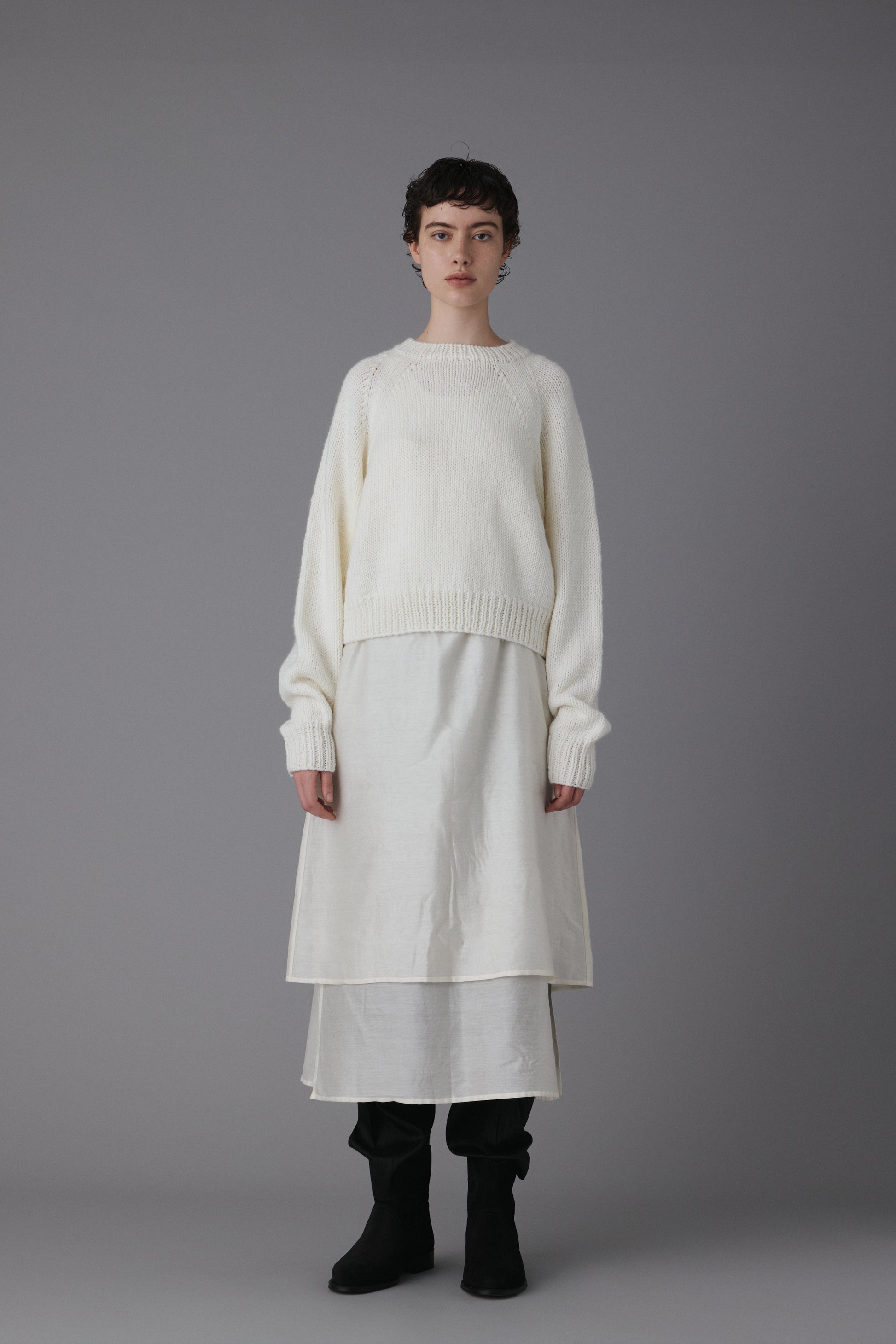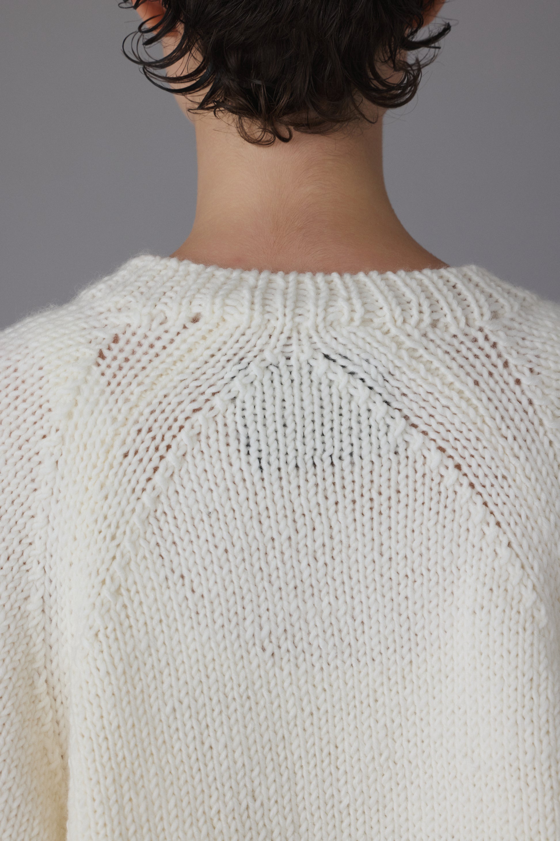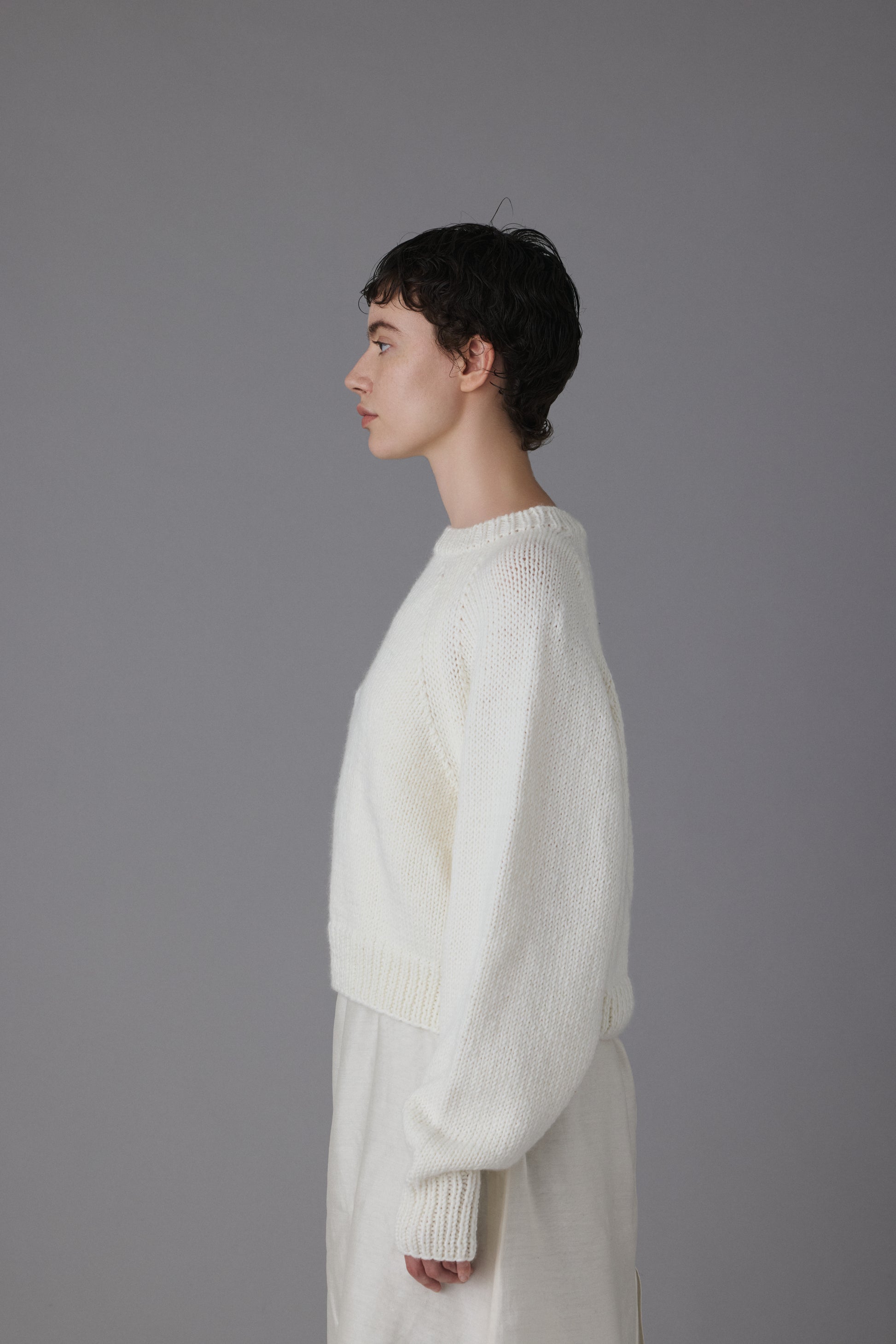 ウールに、わずかにカシミヤを加えたロービング糸。 わずかではあるが、カシミヤがもたらす柔らかなぬめりと肌なじみは驚くほど大きく、軽さとふくらみの中に、ほんのりとした上質感を纏わせています。 この糸を、棒針で一目一目、丁寧に手編み。 素材の呼吸を損なうことなく、ナチュラルで美しい立体感に仕立てました。 横に広がるワイドシルエットと、短めの着丈が織りなす独特のバランス。そこに太めのラグランスリーブと、立体的な“目立て”のラインが、編みの表情を際立たせます。裾や袖口にはリブが走り、ふわりとしたシルエットを引き締める効果も。コンパクトな丈感だからこそ、インナーのレイヤードが活きるデザイン。 ベーシックな着こなしの中に、軽やかなニュアンスが宿る一着です。