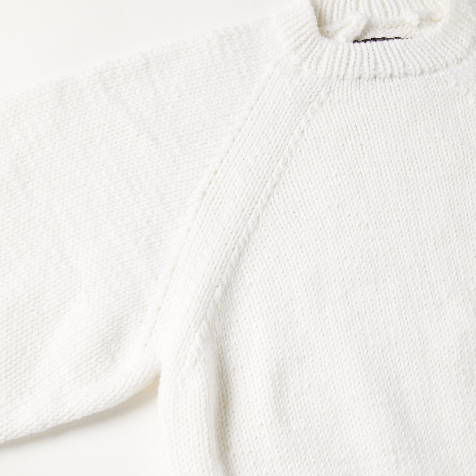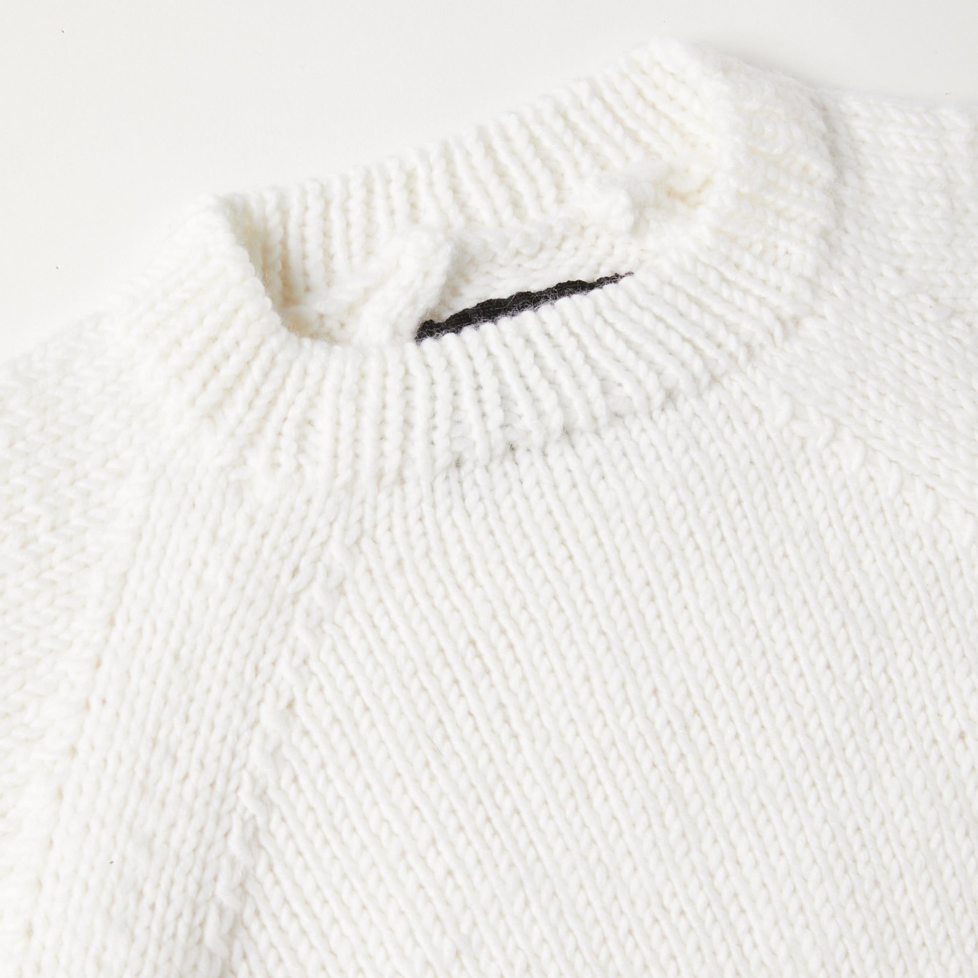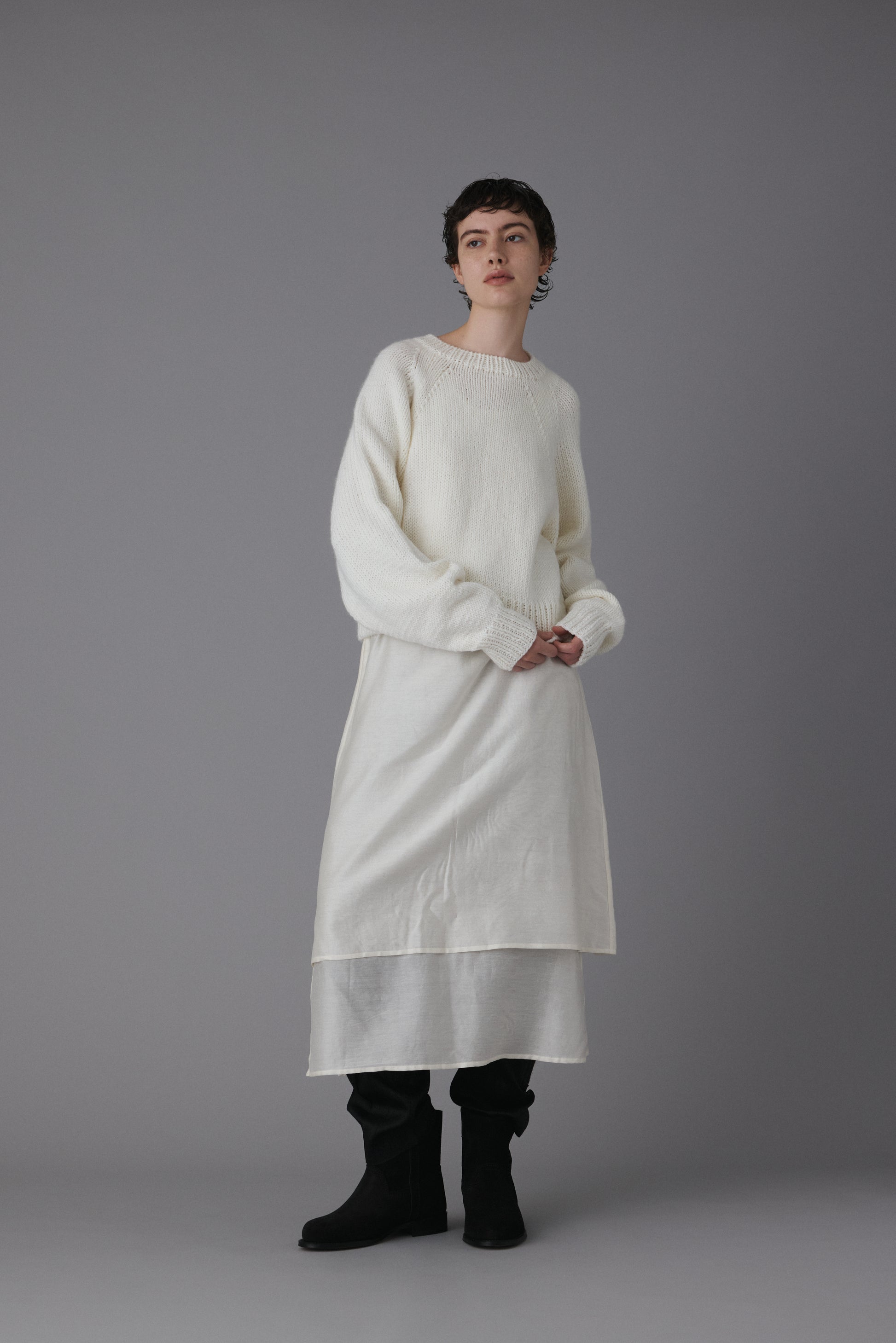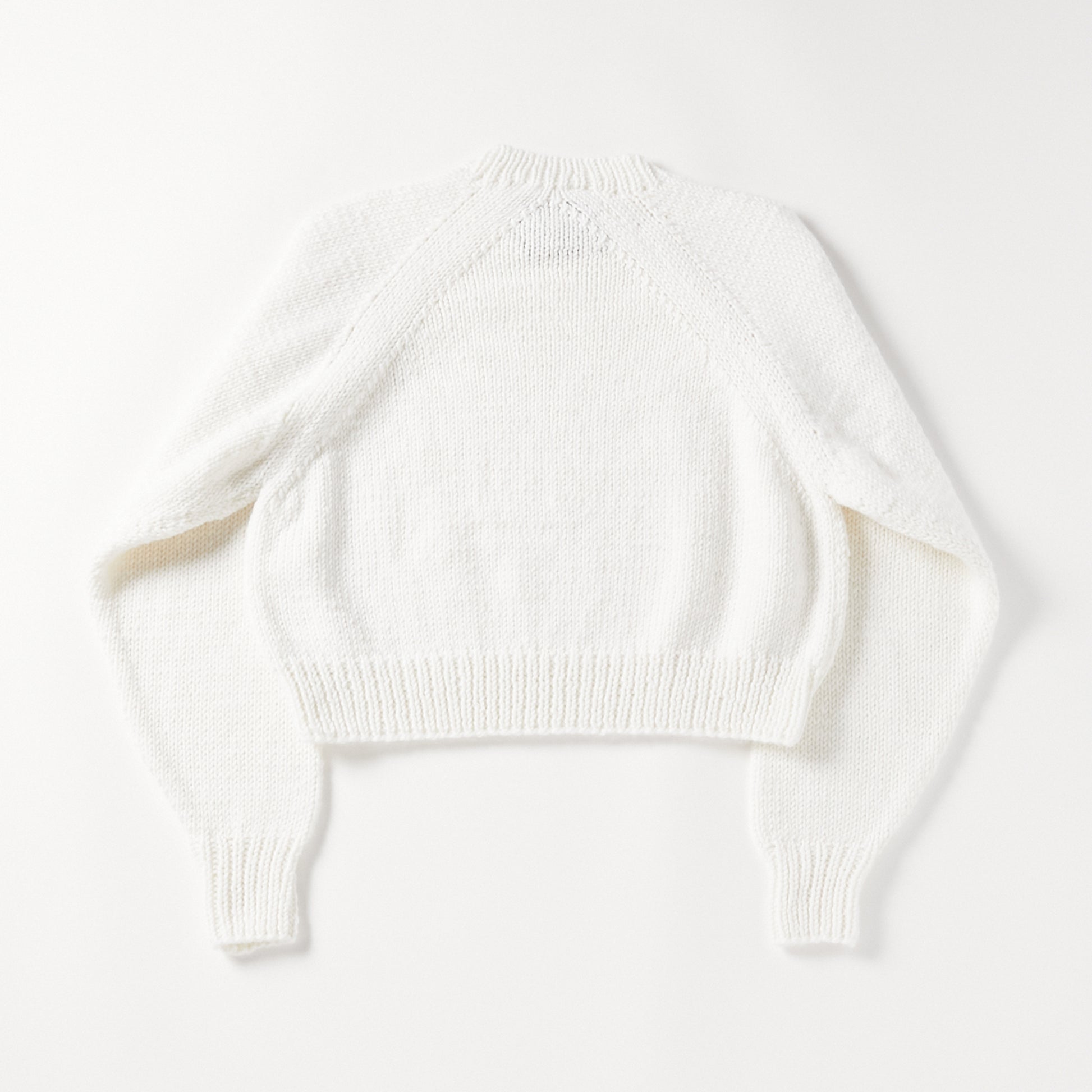 ウールに、わずかにカシミヤを加えたロービング糸。 わずかではあるが、カシミヤがもたらす柔らかなぬめりと肌なじみは驚くほど大きく、軽さとふくらみの中に、ほんのりとした上質感を纏わせています。 この糸を、棒針で一目一目、丁寧に手編み。 素材の呼吸を損なうことなく、ナチュラルで美しい立体感に仕立てました。 横に広がるワイドシルエットと、短めの着丈が織りなす独特のバランス。そこに太めのラグランスリーブと、立体的な“目立て”のラインが、編みの表情を際立たせます。裾や袖口にはリブが走り、ふわりとしたシルエットを引き締める効果も。コンパクトな丈感だからこそ、インナーのレイヤードが活きるデザイン。 ベーシックな着こなしの中に、軽やかなニュアンスが宿る一着です。
