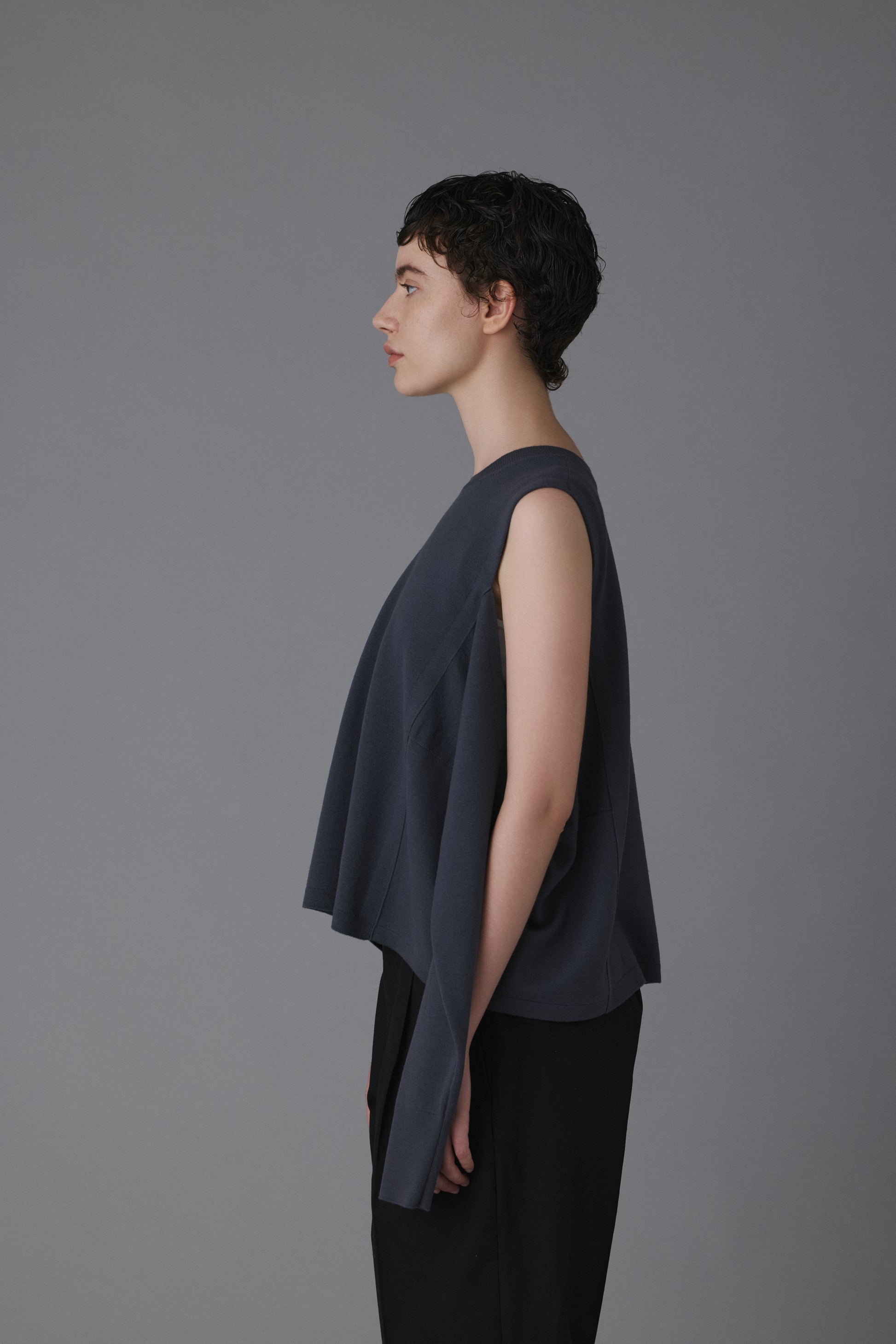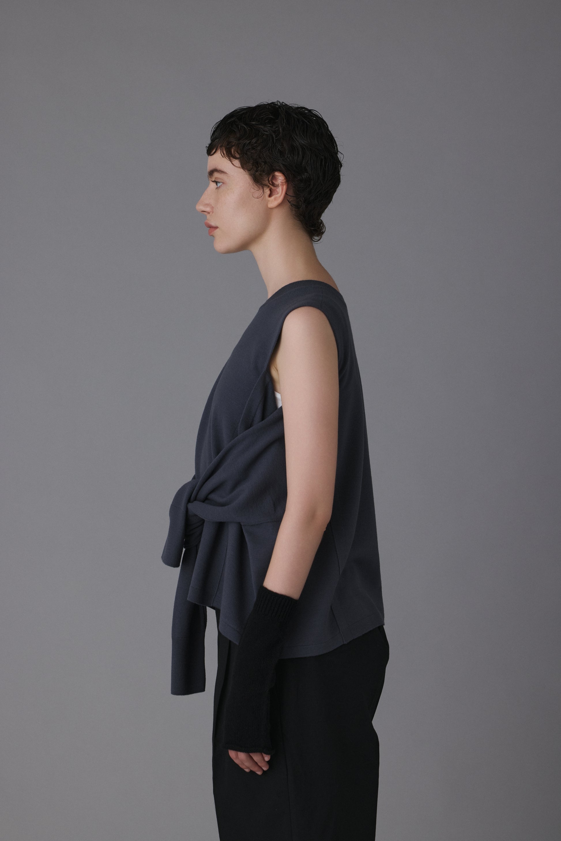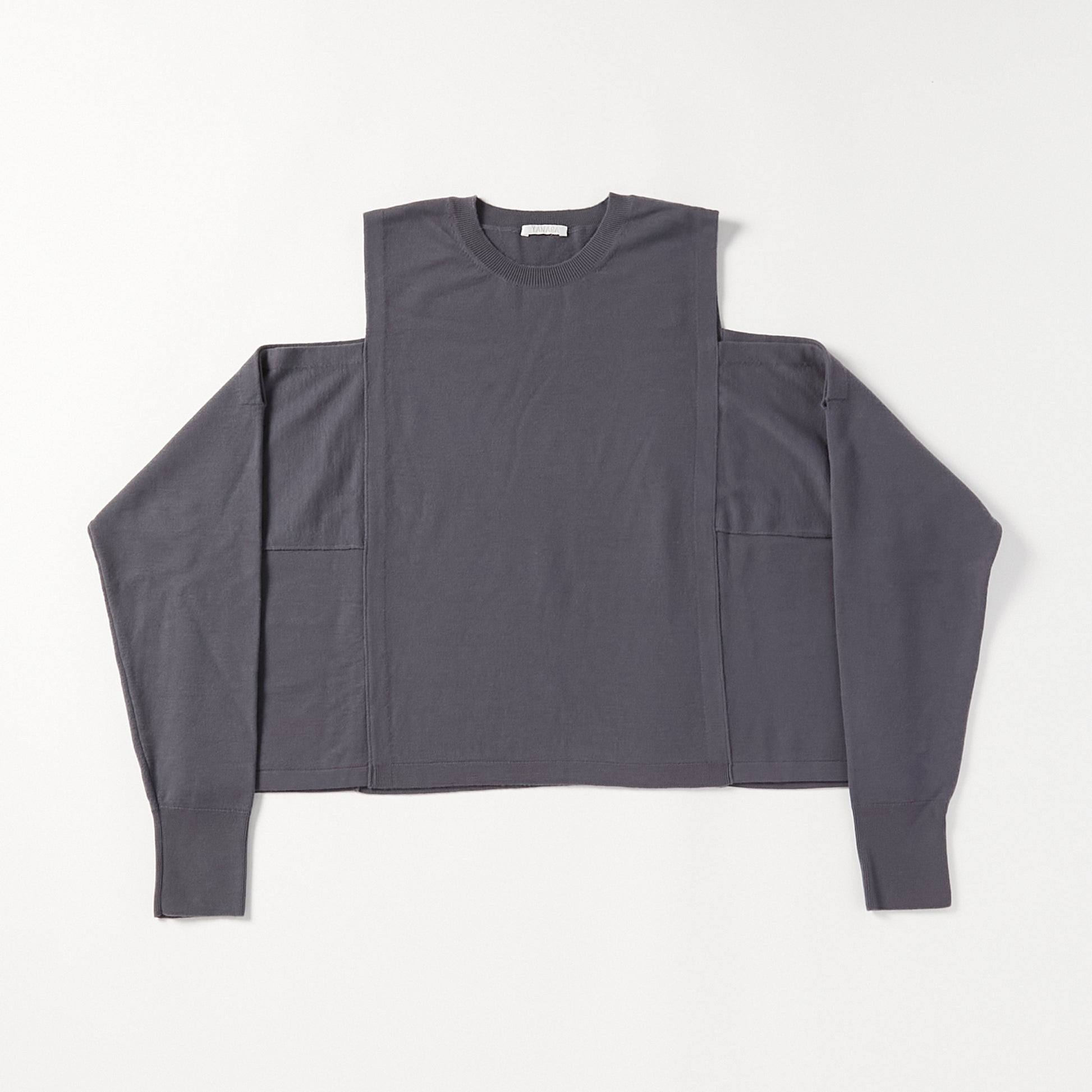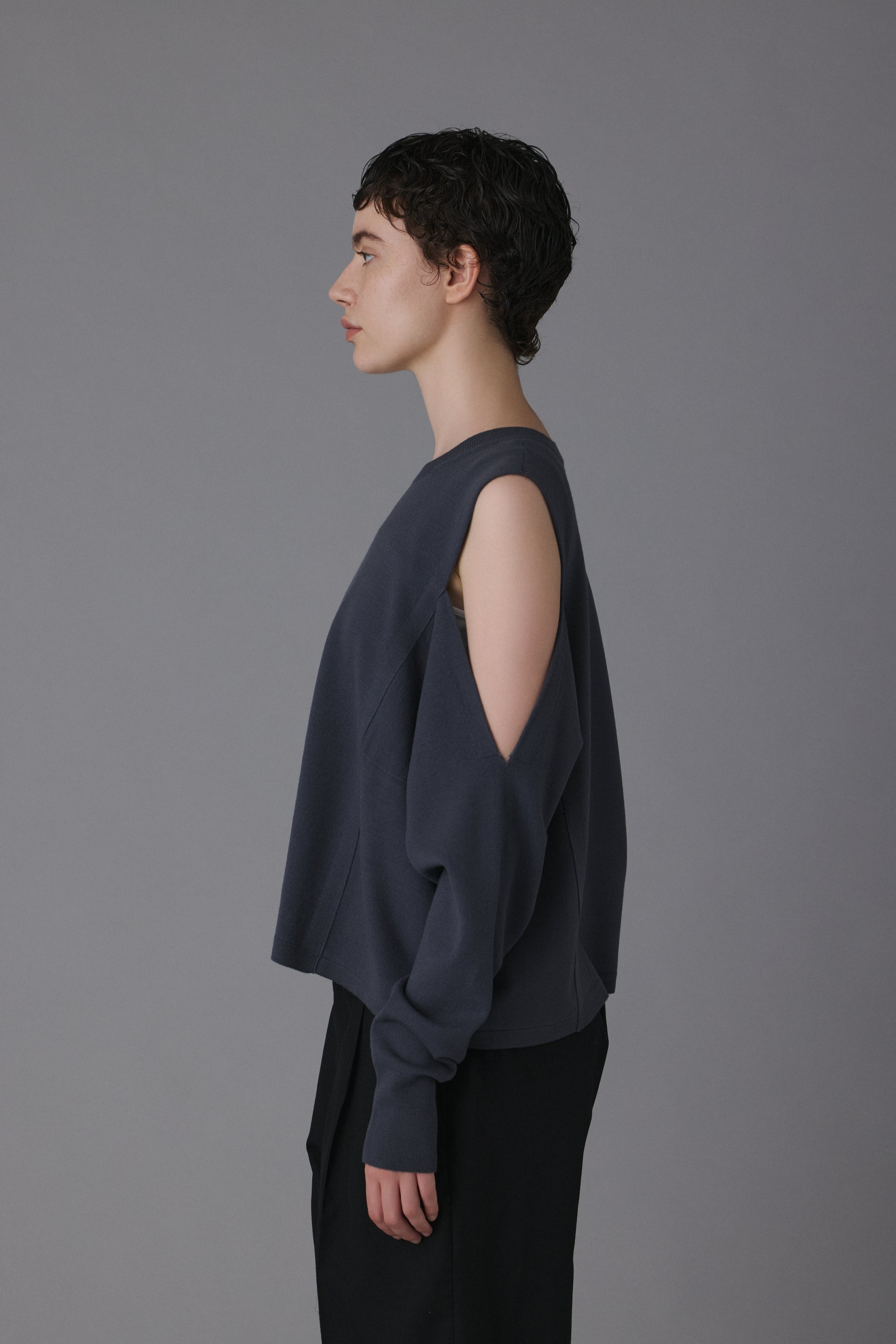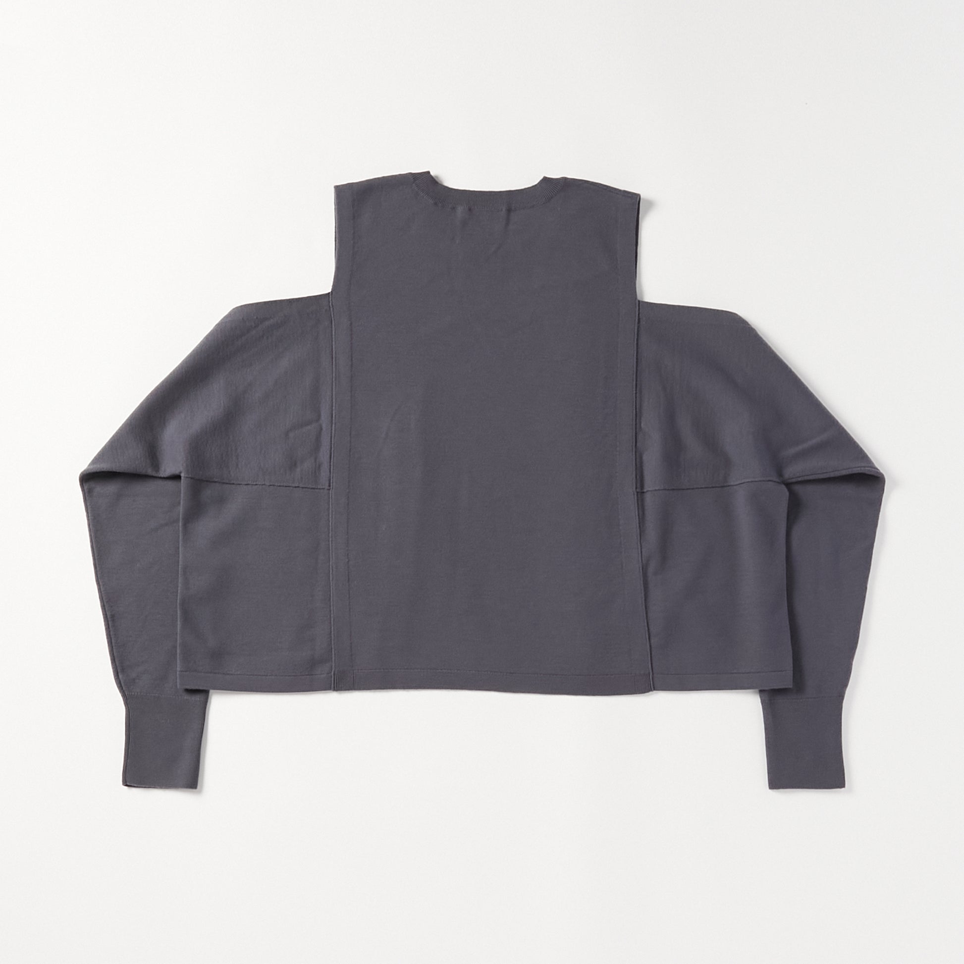 15.5ミクロンという極細繊維の未防縮ウール100%を使用。そのままでも肌が喜ぶような、ぬめり感と繊細な柔らかさを持つ最高級の原料に、強縮絨(きょうしゅくじゅう)加工を施し、生地を縮めて密度を高めました。フェルトのような立体感とハリを持ちつつ、驚くほど軽く、柔らかい。この絶妙なバランスは、素材の純度と16ゲージのハイゲージ編みによる精緻な構造が生むものです。編み目の繊細さがそのまま縮絨後の表情に現れ、上質さを静かに物語っています。 シンプルに見えて、実は多彩なアレンジが可能な一着。肩の開きと変形スリーブが特徴的な新しいニットの形。袖パーツは、ウエストで結んでスリーブレスとしても着用可能。 そのまま袖に腕を通すと、肩のスリットから素肌が覗くモードな表情に。 着方で印象が変化する、多様性ある一着です。