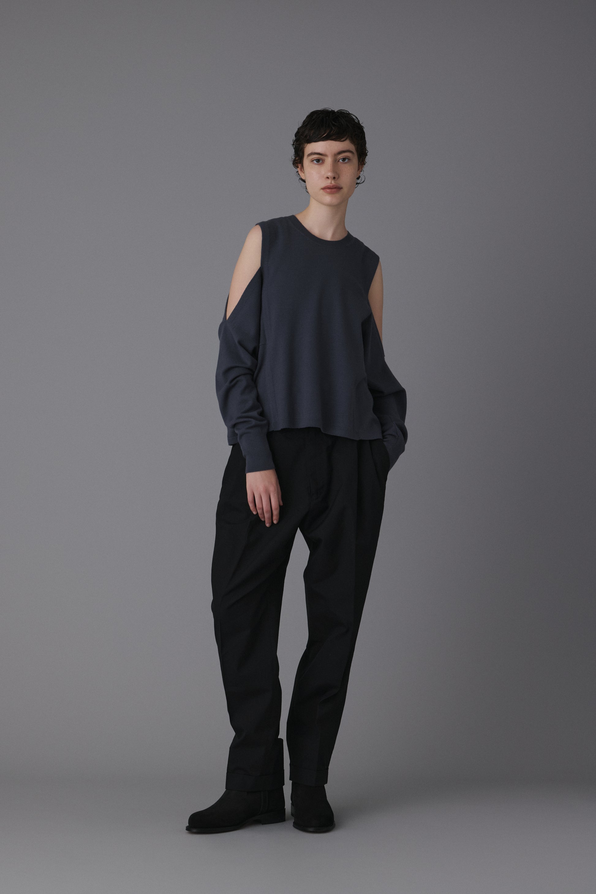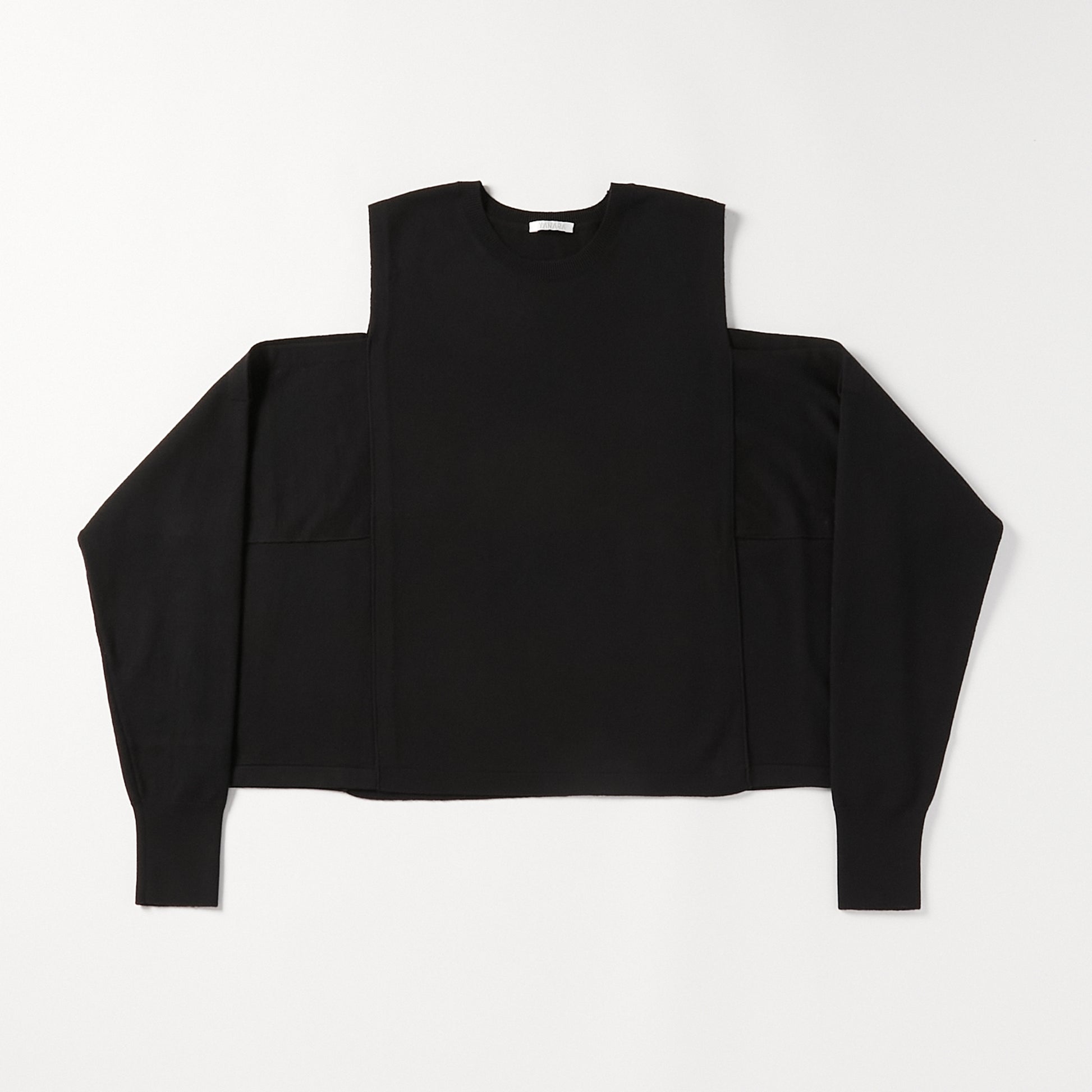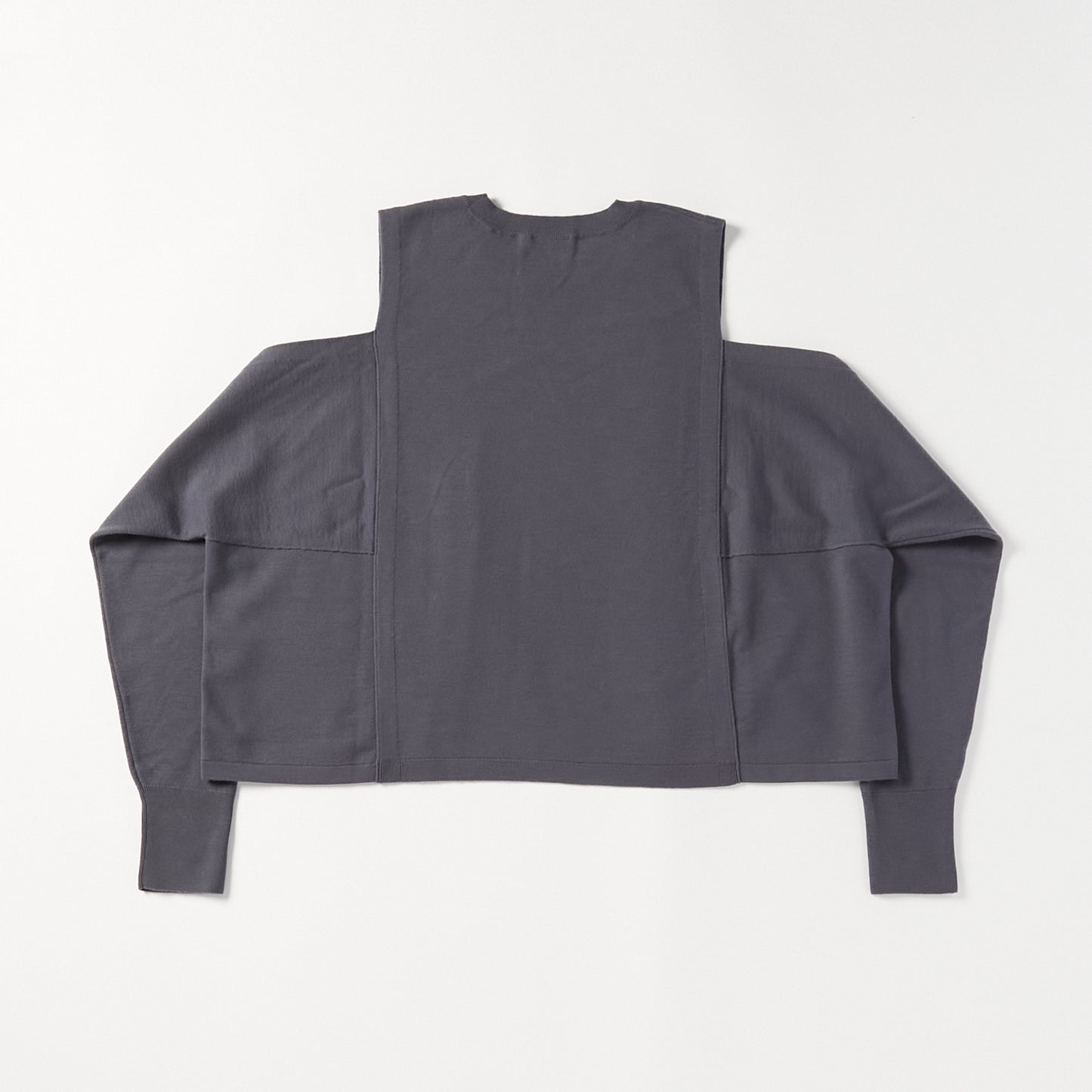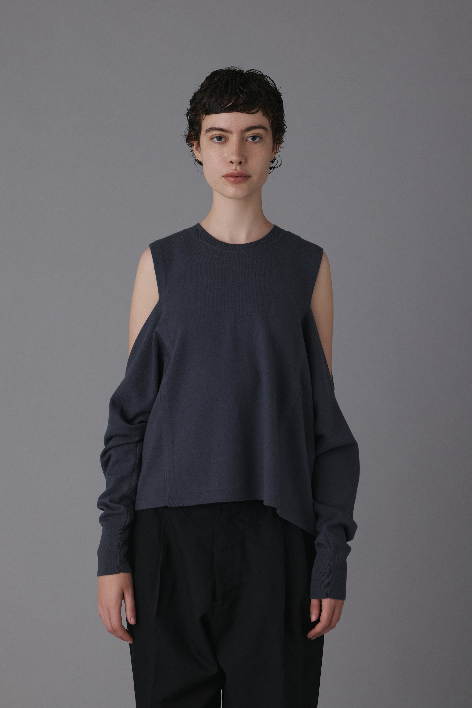 15.5ミクロンという極細繊維の未防縮ウール100%を使用。そのままでも肌が喜ぶような、ぬめり感と繊細な柔らかさを持つ最高級の原料に、強縮絨(きょうしゅくじゅう)加工を施し、生地を縮めて密度を高めました。フェルトのような立体感とハリを持ちつつ、驚くほど軽く、柔らかい。この絶妙なバランスは、素材の純度と16ゲージのハイゲージ編みによる精緻な構造が生むものです。編み目の繊細さがそのまま縮絨後の表情に現れ、上質さを静かに物語っています。 シンプルに見えて、実は多彩なアレンジが可能な一着。肩の開きと変形スリーブが特徴的な新しいニットの形。袖パーツは、ウエストで結んでスリーブレスとしても着用可能。 そのまま袖に腕を通すと、肩のスリットから素肌が覗くモードな表情に。 着方で印象が変化する、多様性ある一着です。