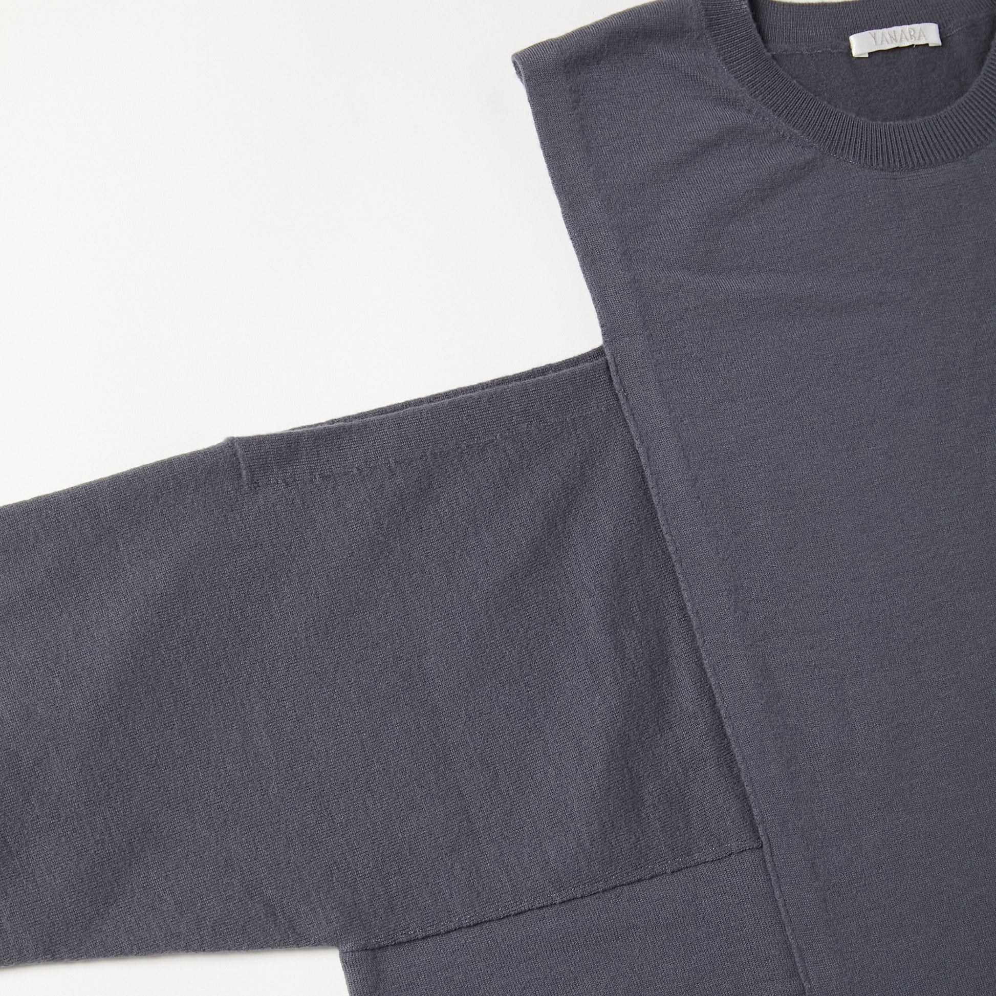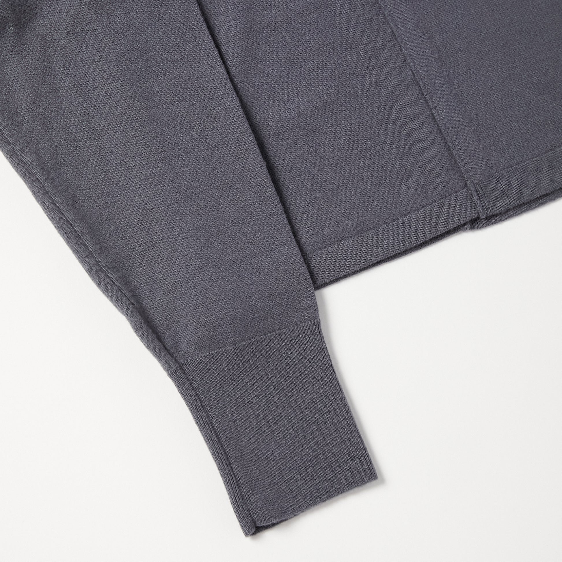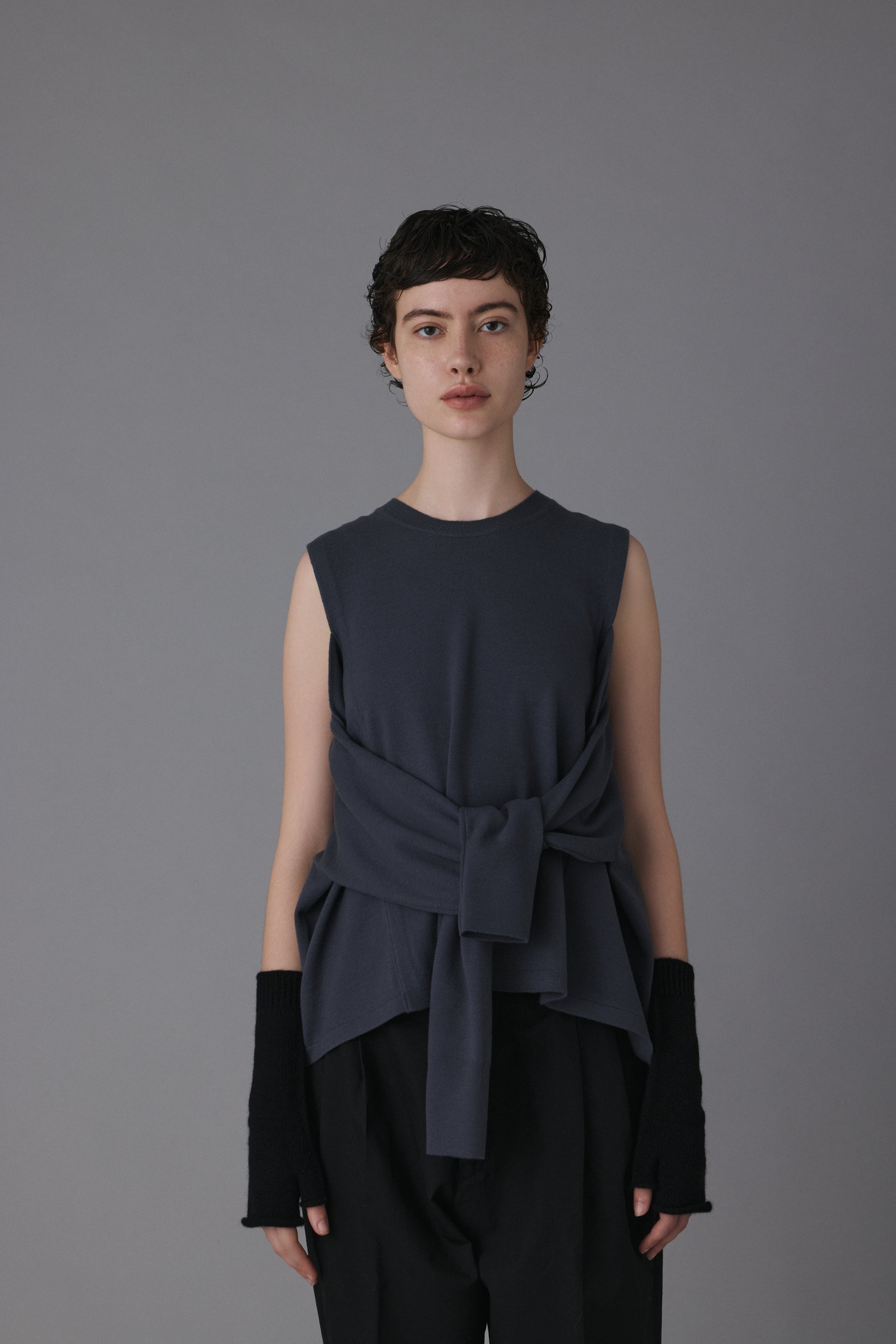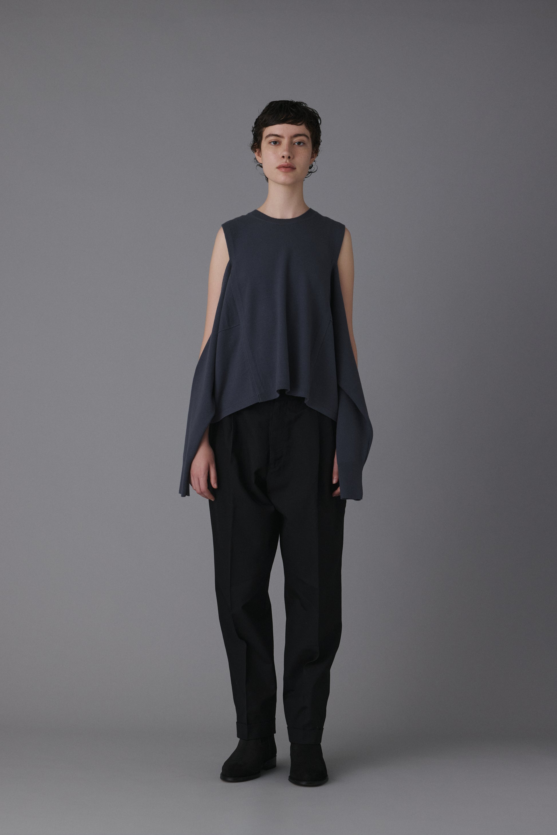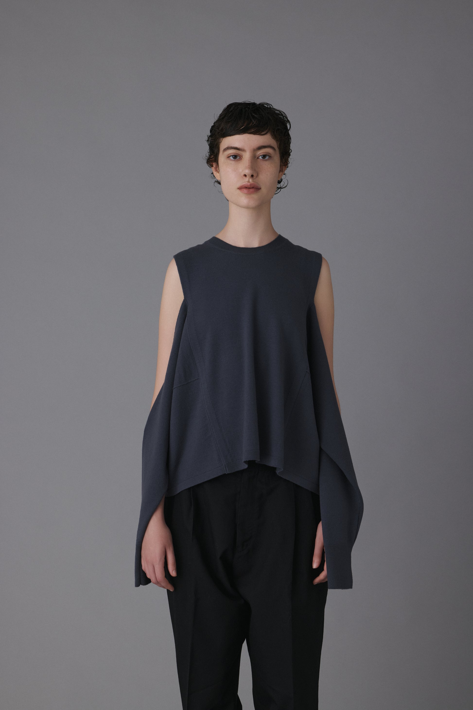 15.5ミクロンという極細繊維の未防縮ウール100%を使用。そのままでも肌が喜ぶような、ぬめり感と繊細な柔らかさを持つ最高級の原料に、強縮絨(きょうしゅくじゅう)加工を施し、生地を縮めて密度を高めました。フェルトのような立体感とハリを持ちつつ、驚くほど軽く、柔らかい。この絶妙なバランスは、素材の純度と16ゲージのハイゲージ編みによる精緻な構造が生むものです。編み目の繊細さがそのまま縮絨後の表情に現れ、上質さを静かに物語っています。 シンプルに見えて、実は多彩なアレンジが可能な一着。肩の開きと変形スリーブが特徴的な新しいニットの形。袖パーツは、ウエストで結んでスリーブレスとしても着用可能。 そのまま袖に腕を通すと、肩のスリットから素肌が覗くモードな表情に。 着方で印象が変化する、多様性ある一着です。